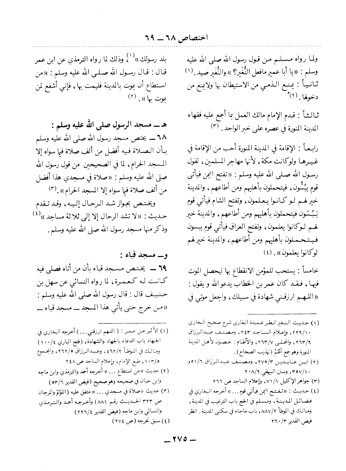 68 - يَخْتَصُّ مَسْجِدُ رَسُول اللَّهِ صَلَّى اللَّهُ عَلَيْهِ وَسَلَّمَ بِأَنَّ الصَّلاَةَ فِيهِ أَفْضَل مِنْ أَلْفِ صَلاَةٍ فِيمَا سِوَاهُ إِلاَّ الْمَسْجِدَ الْحَرَامَ، لِمَا فِي الصَّحِيحَيْنِ مِنْ قَوْل رَسُول اللَّهِ صَلَّى اللَّهُ عَلَيْهِ وَسَلَّمَ: صَلاَةٌ فِي مَسْجِدِي هَذَا أَفْضَل مِنْ أَلْفِ صَلاَةٍ فِيمَا سِوَاهُ إِلاَّ الْمَسْجِدَ الْحَرَامَ. (3) وَيَخْتَصُّ بِجَوَازِ شَدِّ الرِّحَال إِلَيْهِ، وَقَدْ تَقَدَّمَ حَدِيثُ: لاَ تُشَدُّ الرِّحَال إِلاَّ إِلَى ثَلاَثِ مَسَاجِدَ (4) وَذَكَرَ مِنْهَا مَسْجِدَ رَسُول اللَّهِ صَلَّى اللَّهُ عَلَيْهِ وَسَلَّمَ.