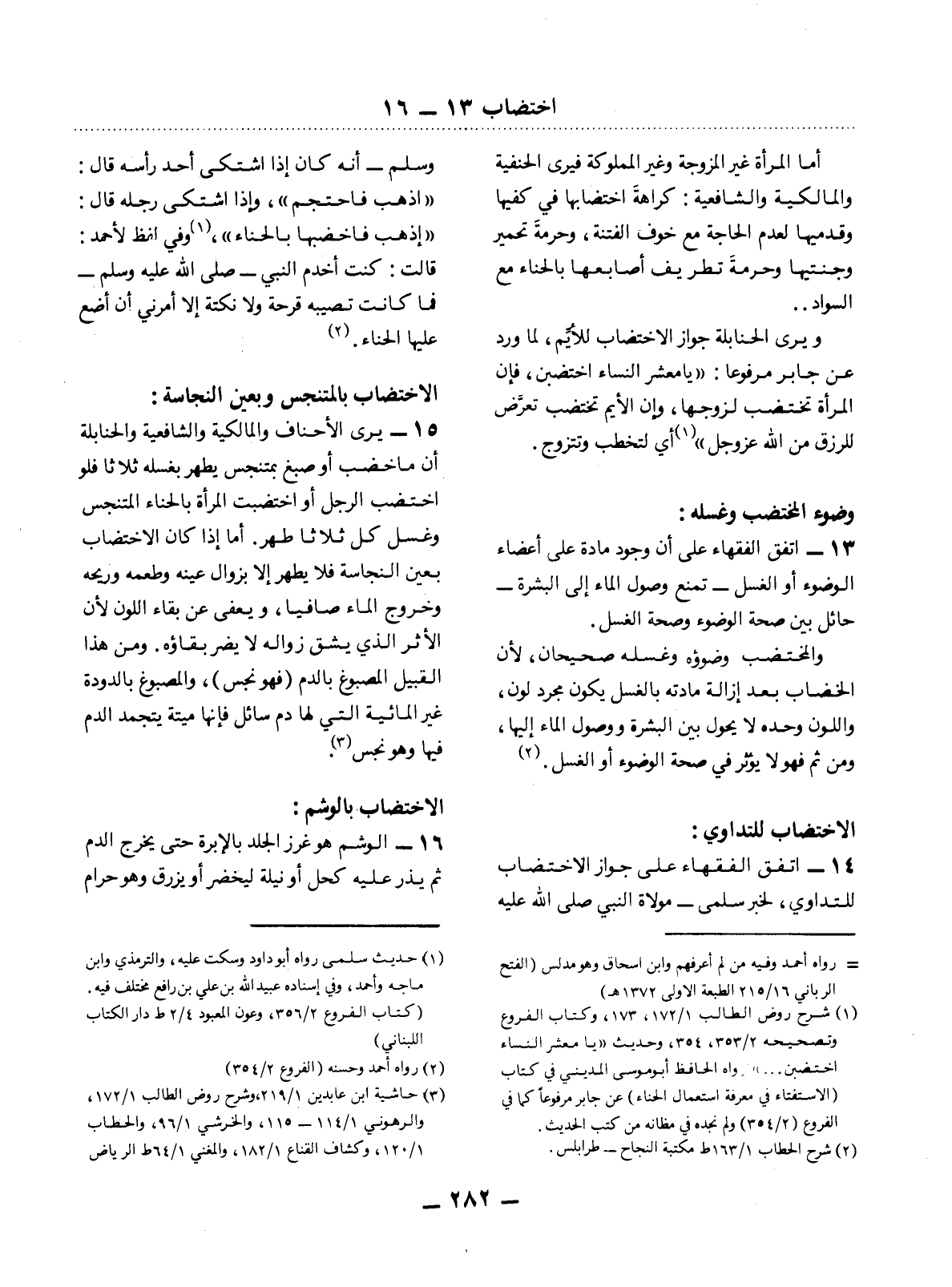 (1) شرح روض الطالب 1 / 172، 173، وكتاب الفروع وتصحيحه 2 / 353، 354، وحديث " يا معشر النساء اختضبن. . . " رواه الحافظ أبو موسى المديني في كتاب (الاستفتاء في معرفة استعمال الحناء) عن جابر مرفوعا كما في الفروع (2 / 354) ولم نجده في مظانه من كتب الحديث.