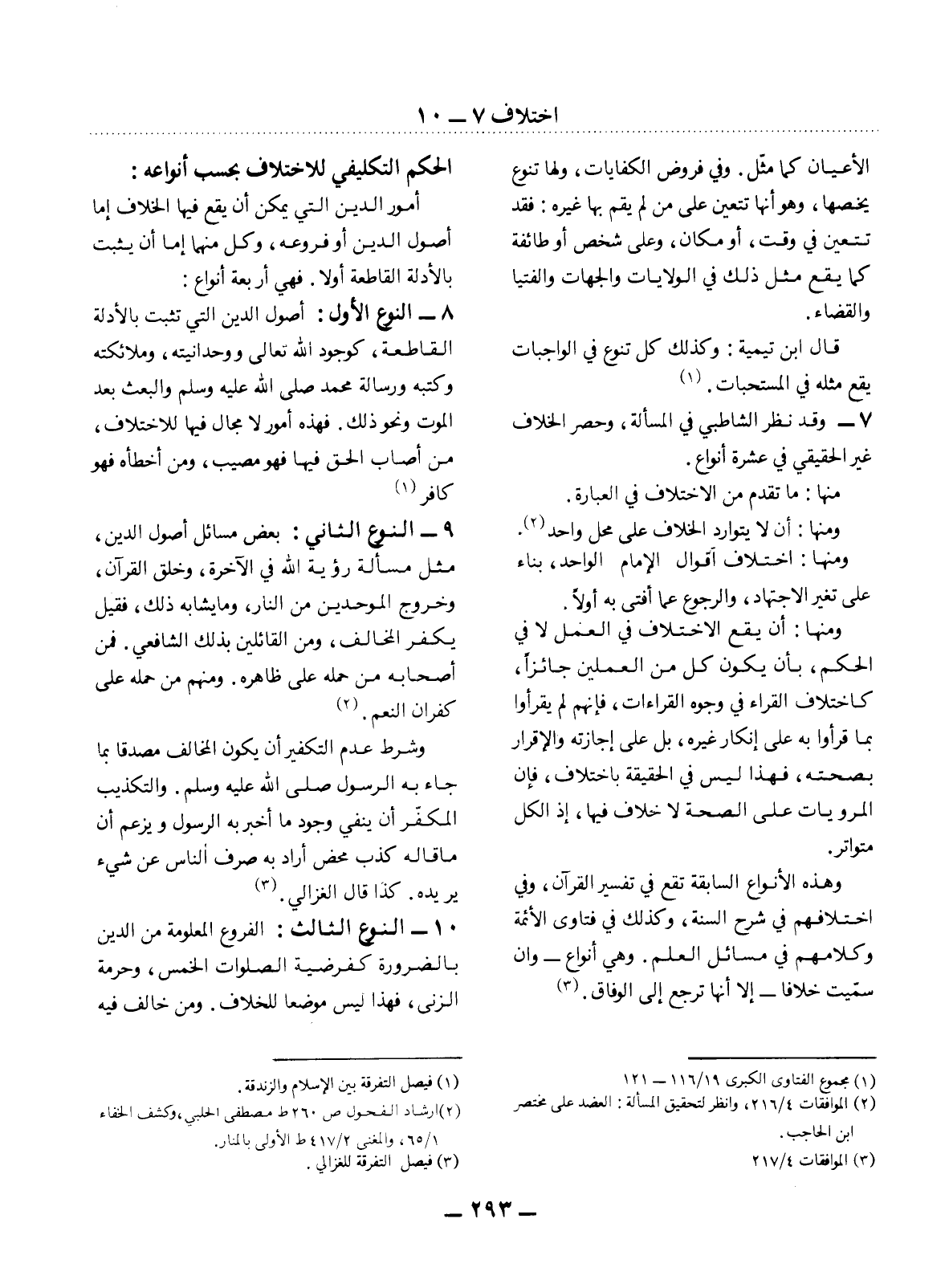 10 - النَّوْعُ الثَّالِثُ: الْفُرُوعُ الْمَعْلُومَةُ مِنَ الدِّينِ بِالضَّرُورَةِ كَفَرْضِيَّةِ الصَّلَوَاتِ الْخَمْسِ، وَحُرْمَةِ الزِّنَا، فَهَذَا لَيْسَ مَوْضِعًا لِلْخِلاَفِ. وَمَنْ خَالَفَ فِيهِ