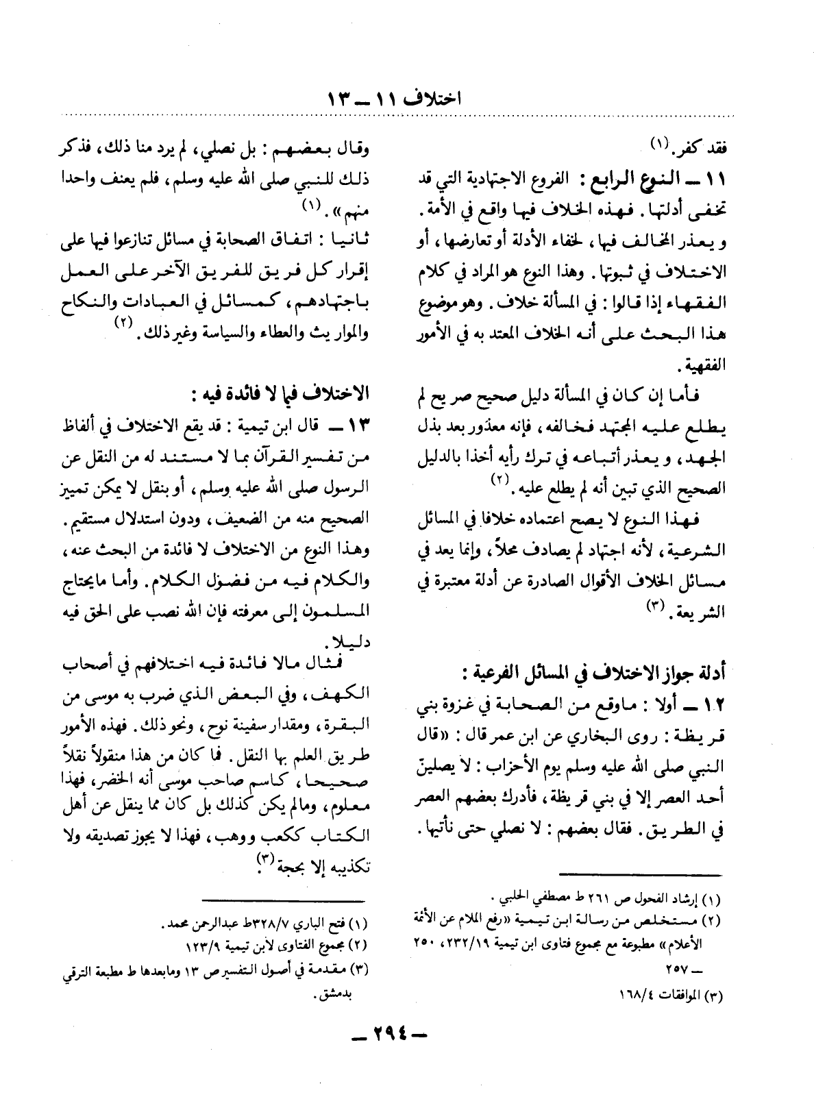 11 - النَّوْعُ الرَّابِعُ: الْفُرُوعُ الاِجْتِهَادِيَّةُ الَّتِي قَدْ تَخْفَى أَدِلَّتُهَا. فَهَذِهِ الْخِلاَفُ فِيهَا وَاقِعٌ فِي الأُْمَّةِ. وَيُعْذَرُ الْمُخَالِفُ فِيهَا؛ لِخَفَاءِ الأَْدِلَّةِ أَوْ تَعَارُضِهَا، أَوِ الاِخْتِلاَفِ فِي ثُبُوتِهَا. وَهَذَا النَّوْعُ هُوَ الْمُرَادُ فِي كَلاَمِ الْفُقَهَاءِ إِذَا قَالُوا: فِي الْمَسْأَلَةِ خِلاَفٌ. وَهُوَ مَوْضُوعُ هَذَا الْبَحْثِ عَلَى أَنَّهُ الْخِلاَفُ الْمُعْتَدُّ بِهِ فِي الأُْمُورِ الْفِقْهِيَّةِ.