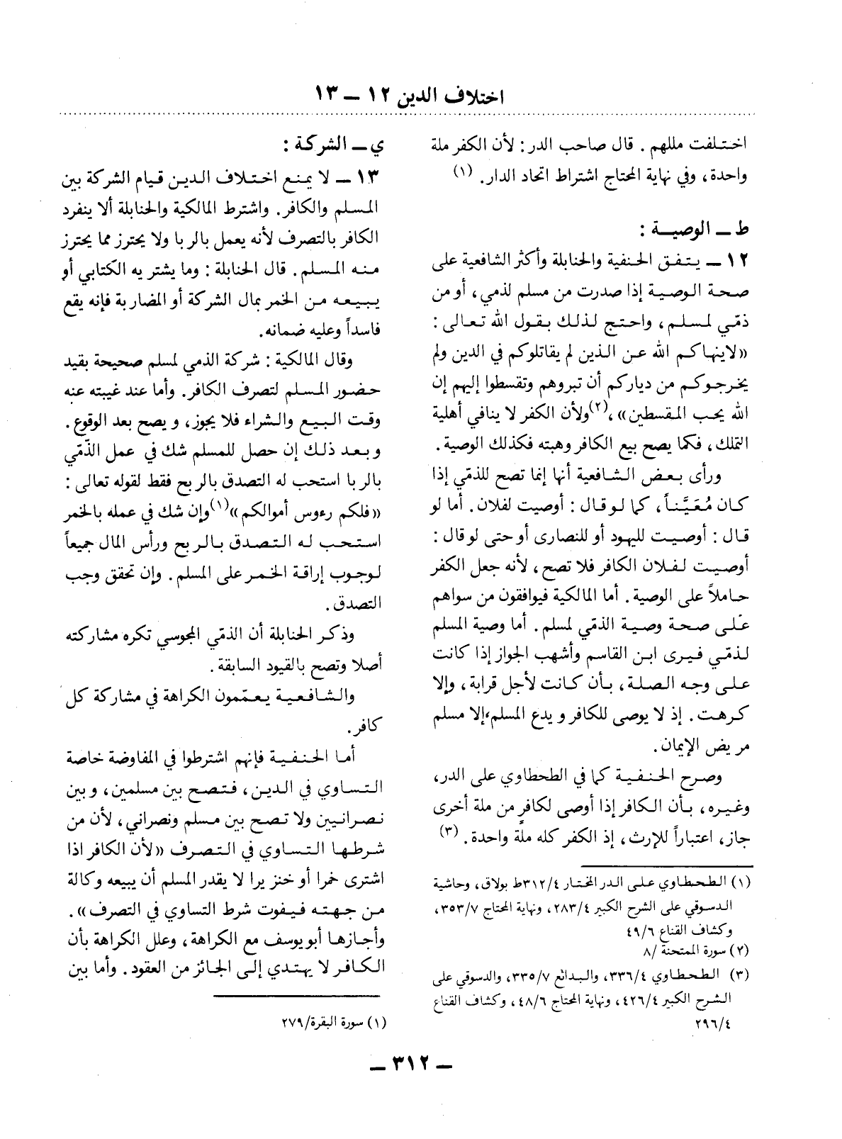 13 - لاَ يَمْنَعُ اخْتِلاَفُ الدِّينِ قِيَامَ الشَّرِكَةِ بَيْنَ الْمُسْلِمِ وَالْكَافِرِ. وَاشْتَرَطَ الْمَالِكِيَّةُ وَالْحَنَابِلَةُ أَلاَّ يَنْفَرِدَ الْكَافِرُ بِالتَّصَرُّفِ لأَِنَّهُ يَعْمَل بِالرِّبَا وَلاَ يَحْتَرِزُ مِمَّا يَحْتَرِزُ مِنْهُ الْمُسْلِمُ. قَال الْحَنَابِلَةُ: وَمَا يَشْتَرِيهِ الْكِتَابِيُّ أَوْ يَبِيعُهُ مِنَ الْخَمْرِ بِمَال الشَّرِكَةِ أَوِ الْمُضَارَبَةِ فَإِنَّهُ يَقَعُ فَاسِدًا وَعَلَيْهِ ضَمَانُهُ. وَقَال الْمَالِكِيَّةُ: شَرِكَةُ الذِّمِّيِّ لِمُسْلِمٍ صَحِيحَةٌ بِقَيْدِ حُضُورِ الْمُسْلِمِ لِتَصَرُّفِ الْكَافِرِ. وَأَمَّا عِنْدَ غَيْبَتِهِ عَنْهُ وَقْتَ الْبَيْعِ وَالشِّرَاءِ فَلاَ يَجُوزُ، وَيَصِحُّ بَعْدَ الْوُقُوعِ. وَبَعْدَ ذَلِكَ إِنْ حَصَل لِلْمُسْلِمِ شَكٌّ فِي عَمَل الذِّمِّيِّ بِالرِّبَا اسْتُحِبَّ لَهُ التَّصَدُّقُ بِالرِّبْحِ فَقَطْ لِقَوْلِهِ تَعَالَى: {فَلَكُمْ رُءُوسُ أَمْوَالِكُمْ} (1) وَإِنْ شَكَّ فِي عَمَلِهِ بِالْخَمْرِ اسْتُحِبَّ لَهُ التَّصَدُّقُ بِالرِّبْحِ وَرَأْسِ الْمَال جَمِيعًا لِوُجُوبِ إِرَاقَةِ الْخَمْرِ عَلَى الْمُسْلِمِ. وَإِنْ تَحَقَّقَ وَجَبَ التَّصَدُّقُ. وَذَكَرَ الْحَنَابِلَةُ أَنَّ الذِّمِّيَّ الْمَجُوسِيَّ تُكْرَهُ مُشَارَكَتُهُ أَصْلاً وَتَصِحُّ بِالْقُيُودِ السَّابِقَةِ. وَالشَّافِعِيَّةُ يُعَمِّمُونَ الْكَرَاهَةَ فِي مُشَارَكَةِ كُل كَافِرٍ.