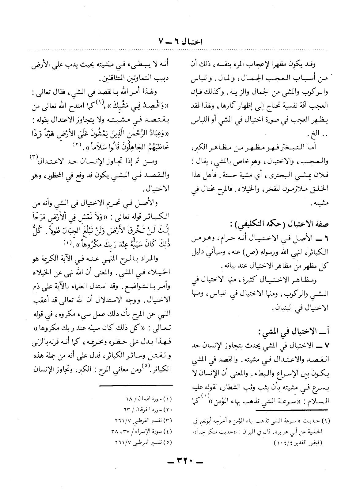 7 - الاِخْتِيَال فِي الْمَشْيِ يَحْدُثُ بِتَجَاوُزِ الإِْنْسَانِ حَدَّ الْقَصْدِ وَالاِعْتِدَال فِي مِشْيَتِهِ. وَالْقَصْدُ فِي الْمَشْيِ يَكُونُ بَيْنَ الإِْسْرَاعِ وَالْبُطْءِ. وَالْمَعْنَى أَنَّ الإِْنْسَانَ لاَ يُسْرِعُ فِي مِشْيَتِهِ بِأَنْ يَثِبَ وَثْبَ الشُّطَّارِ، لِقَوْلِهِ عَلَيْهِ السَّلَامُ: سُرْعَةُ الْمَشْيِ مُذْهِبُ بِهَاءِ الْمُؤْمِنِ (1) كَمَا