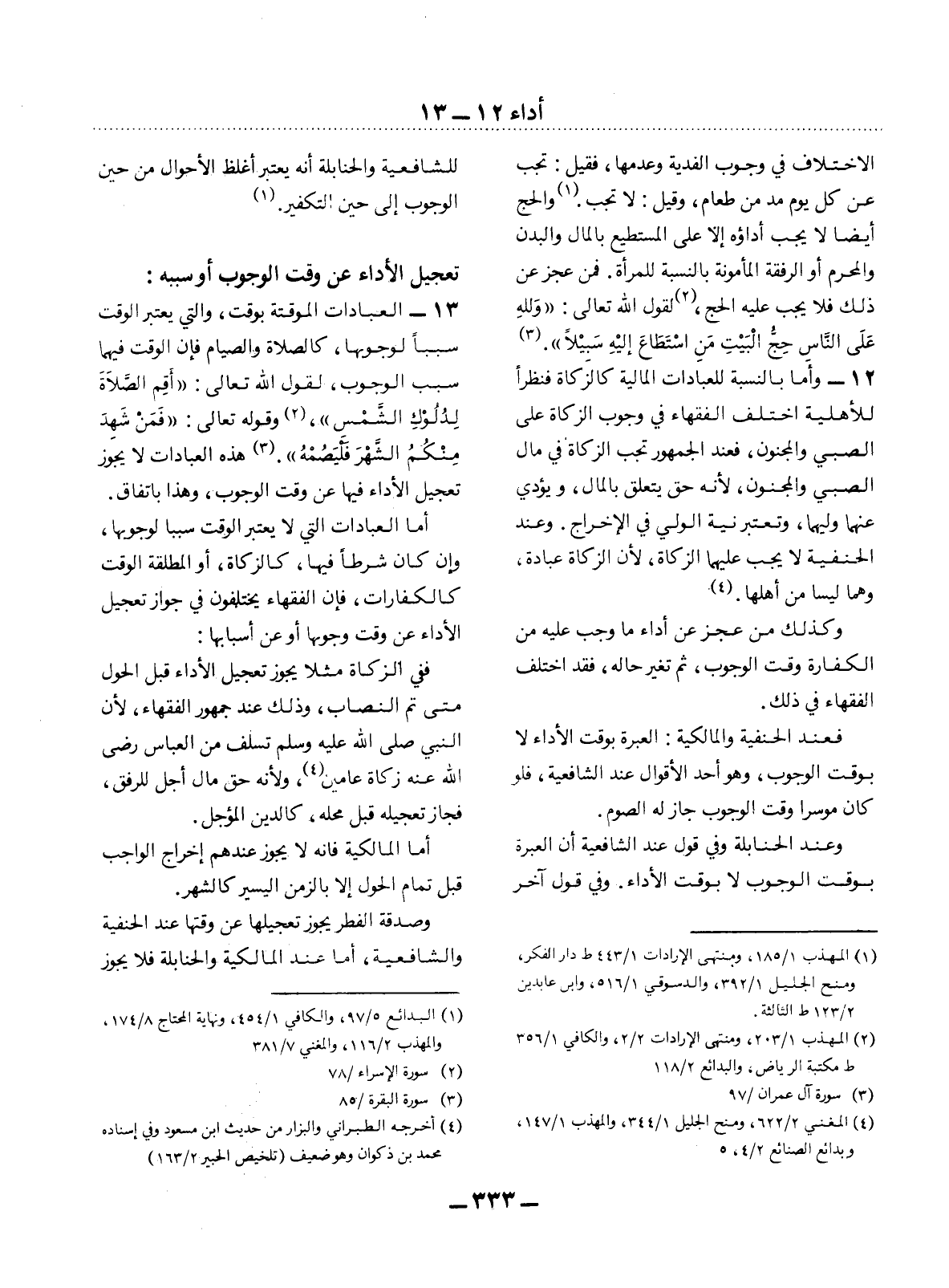 13 - الْعِبَادَاتُ الْمُوَقَّتَةُ بِوَقْتٍ، وَالَّتِي يُعْتَبَرُ الْوَقْتُ سَبَبًا لِوُجُوبِهَا، كَالصَّلاَةِ وَالصِّيَامِ فَإِنَّ الْوَقْتَ فِيهِمَا سَبَبُ الْوُجُوبِ؛ لِقَوْل اللَّهِ تَعَالَى: {أَقِمِ الصَّلاَةَ لِدُلُوكِ الشَّمْسِ (2) } ، وقَوْله تَعَالَى: {فَمَنْ شَهِدَ مِنْكُمُ الشَّهْرَ فَلْيَصُمْهُ (3) } . هَذِهِ الْعِبَادَاتُ لاَ يَجُوزُ تَعْجِيل الأَْدَاءِ فِيهَا عَنْ وَقْتِ الْوُجُوبِ، وَهَذَا بِاتِّفَاقٍ. أَمَّا الْعِبَادَاتُ الَّتِي لاَ يُعْتَبَرُ الْوَقْتُ سَبَبًا لِوُجُوبِهَا، وَإِنْ كَانَ شَرْطًا فِيهَا، كَالزَّكَاةِ، أَوِ الْمُطْلَقَةِ الْوَقْتِ كَالْكَفَّارَاتِ، فَإِنَّ الْفُقَهَاءَ يَخْتَلِفُونَ فِي جَوَازِ تَعْجِيل الأَْدَاءِ عَنْ وَقْتِ وُجُوبِهَا أَوْ عَنْ أَسْبَابِهَا: فَفِي الزَّكَاةِ مَثَلاً يَجُوزُ تَعْجِيل الأَْدَاءِ قَبْل الْحَوْل مَتَى تَمَّ النِّصَابُ، وَذَلِكَ عِنْدَ جُمْهُورِ الْفُقَهَاءِ، لأَِنَّ النَّبِيَّ صَلَّى اللَّهُ عَلَيْهِ وَسَلَّمَ تَسَلَّفَ مِنَ الْعَبَّاسِ رَضِيَ اللَّهُ عَنْهُ زَكَاةَ عَامَيْنِ (4) ؛ وَلأَِنَّهُ حَقُّ مَالٍ أُجِّل لِلرِّفْقِ، فَجَازَ تَعْجِيلُهُ قَبْل مَحِلِّهِ، كَالدَّيْنِ الْمُؤَجَّل.