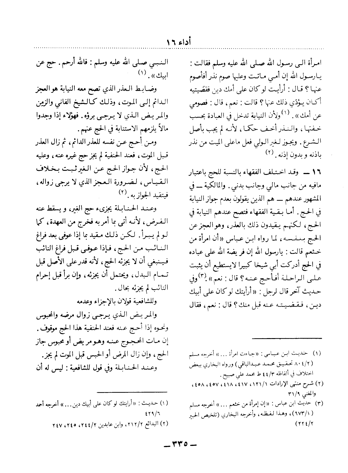 16 - وَقَدِ اخْتَلَفَ الْفُقَهَاءُ بِالنِّسْبَةِ لِلْحَجِّ بِاعْتِبَارِ مَا فِيهِ مِنْ جَانِبٍ مَالِيٍّ وَجَانِبٍ بَدَنِيٍّ. وَالْمَالِكِيَّةُ - فِي الْمَشْهُورِ عِنْدَهُمْ - هُمُ الَّذِينَ يَقُولُونَ بِعَدَمِ جَوَازِ النِّيَابَةِ فِي الْحَجِّ. أَمَّا بَقِيَّةُ الْفُقَهَاءِ فَتَصِحُّ عِنْدَهُمُ النِّيَابَةُ فِي الْحَجِّ، لَكِنَّهُمْ يُقَيِّدُونَ ذَلِكَ بِالْعُذْرِ، وَهُوَ الْعَجْزُ عَنِ الْحَجِّ بِنَفْسِهِ؛ لِمَا رَوَاهُ ابْنُ عَبَّاسٍ أَنَّ امْرَأَةً مِنْ خَثْعَمَ قَالَتْ: يَا رَسُول اللَّهِ إِنَّ فَرِيضَةَ اللَّهِ عَلَى عِبَادِهِ فِي الْحَجِّ أَدْرَكَتْ أَبِي شَيْخًا كَبِيرًا لاَ يَسْتَطِيعُ أَنْ يَثْبُتَ عَلَى الرَّاحِلَةِ أَفَأَحُجُّ عَنْهُ؟ قَال: نَعَمْ. (3)