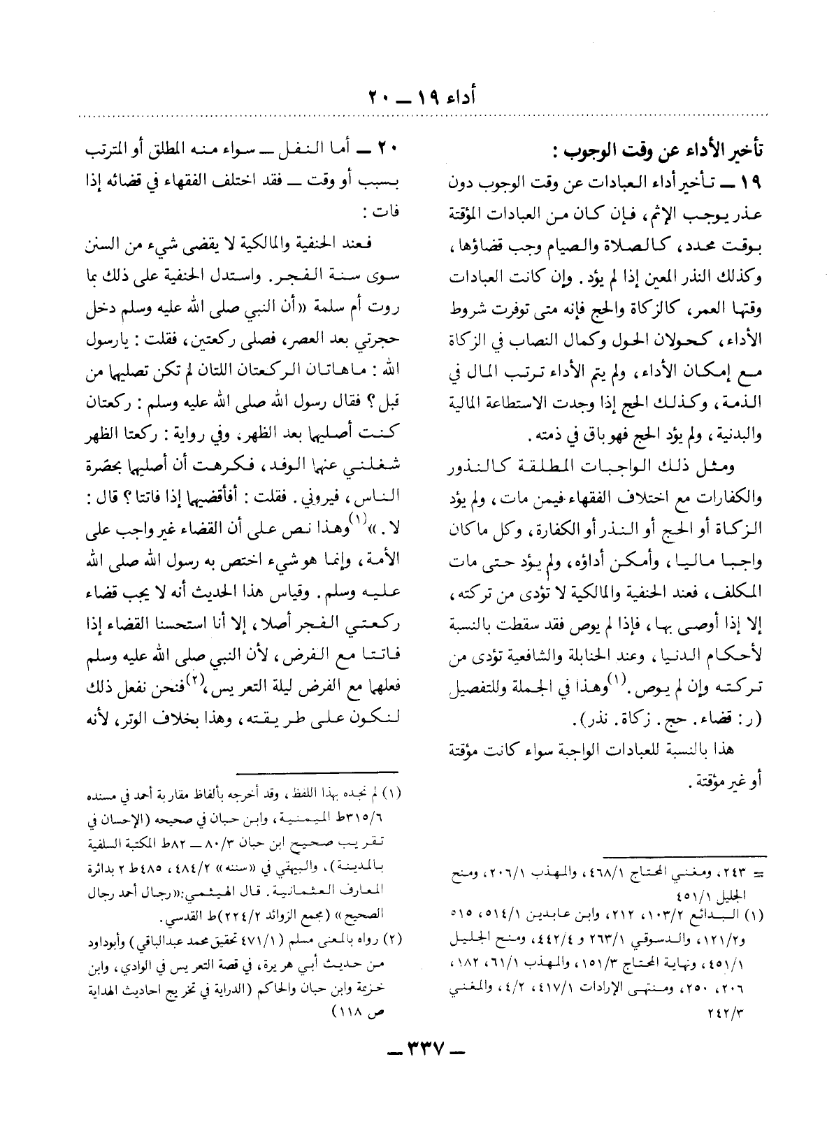 19 - تَأْخِيرُ أَدَاءِ الْعِبَادَاتِ عَنْ وَقْتِ الْوُجُوبِ دُونَ عُذْرٍ يُوجِبُ الإِْثْمَ، فَإِنْ كَانَ مِنَ الْعِبَادَاتِ الْمُؤَقَّتَةِ بِوَقْتٍ مُحَدَّدٍ، كَالصَّلاَةِ وَالصِّيَامِ وَجَبَ قَضَاؤُهَا، وَكَذَلِكَ النَّذْرُ الْمُعَيَّنُ إِذَا لَمْ يُؤَدَّ. وَإِنْ كَانَتِ الْعِبَادَاتُ وَقْتُهَا الْعُمْرُ، كَالزَّكَاةِ وَالْحَجِّ فَإِنَّهُ مَتَى تَوَفَّرَتْ شُرُوطُ الأَْدَاءِ، كَحَوَلاَنِ الْحَوْل وَكَمَال النِّصَابِ فِي الزَّكَاةِ مَعَ إِمْكَانِ الأَْدَاءِ، وَلَمْ يَتِمَّ الأَْدَاءُ تَرَتَّبَ الْمَال فِي الذِّمَّةِ، وَكَذَلِكَ الْحَجُّ إِذَا وُجِدَتِ الاِسْتِطَاعَةُ الْمَالِيَّةُ وَالْبَدَنِيَّةُ، وَلَمْ يُؤَدِّ الْحَجَّ فَهُوَ بَاقٍ فِي ذِمَّتِهِ.
