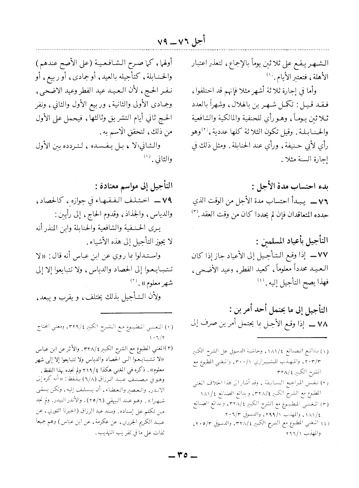 79 - اخْتَلَفَ الْفُقَهَاءُ فِي جَوَازِهِ، كَالْحَصَادِ، وَالدِّيَاسِ، وَالْجُذَاذِ، وَقُدُومِ الْحَاجِّ، إِلَى رَأْيَيْنِ: يَرَى الْحَنَفِيَّةُ وَالشَّافِعِيَّةُ وَالْحَنَابِلَةُ وَابْنُ الْمُنْذِرِ أَنَّهُ لاَ يَجُوزُ التَّأْجِيل إِلَى هَذِهِ الأَْشْيَاءِ. وَاسْتَدَلُّوا بِمَا رُوِيَ عَنِ ابْنِ عَبَّاسٍ أَنَّهُ قَال: لاَ تَتَبَايَعُوا إِلَى الْحَصَادِ وَالدِّيَاسِ، وَلاَ تَتَبَايَعُوا إِلاَّ إِلَى شَهْرٍ مَعْلُومٍ (2) . وَلأَِنَّ التَّأْجِيل بِذَلِكَ يَخْتَلِفُ، وَيَقْرَبُ وَيَبْعُدُ،