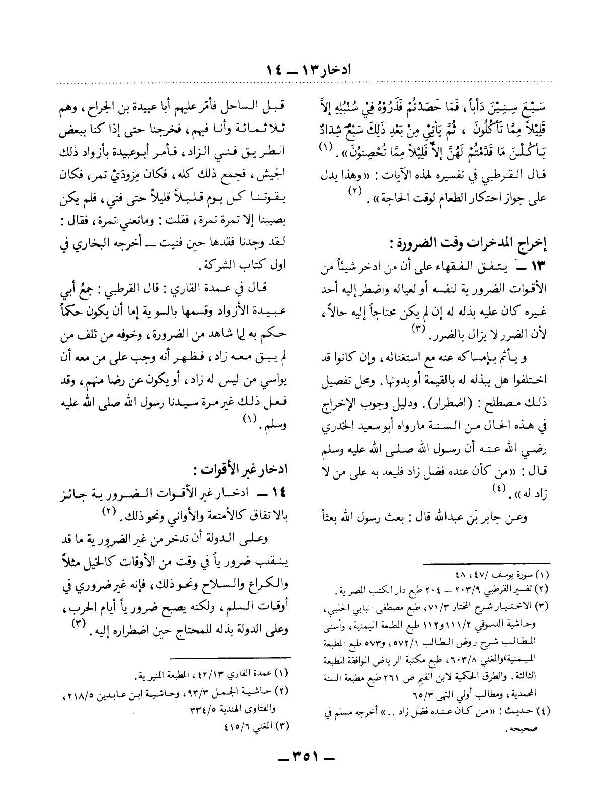 وَعَلَى الدَّوْلَةِ أَنْ تَدَّخِرَ مِنْ غَيْرِ الضَّرُورِيَّةِ مَا قَدْ يَنْقَلِبُ ضَرُورِيًّا فِي وَقْتٍ مِنَ الأَْوْقَاتِ كَالْخَيْل مَثَلاً وَالْكُرَاعِ وَالسِّلاَحِ وَنَحْوِ ذَلِكَ، فَإِنَّهُ غَيْرُ ضَرُورِيٍّ فِي أَوْقَاتِ السِّلْمِ، وَلَكِنَّهُ يُصْبِحُ ضَرُورِيًّا أَيَّامَ الْحَرْبِ، وَعَلَى الدَّوْلَةِ بَذْلُهُ لِلْمُحْتَاجِ حِينَ اضْطِرَارِهِ إِلَيْهِ (3) .