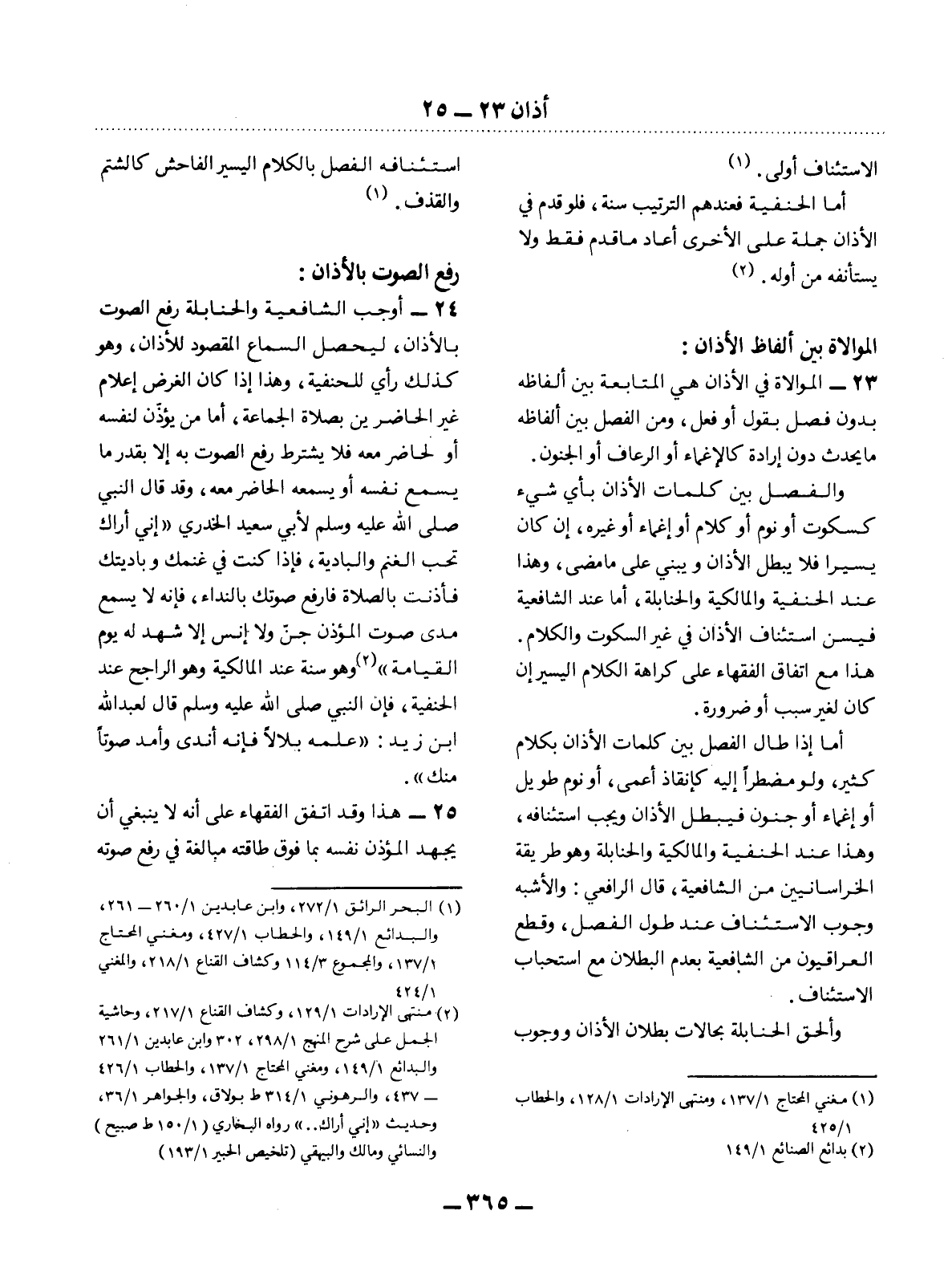 23 - الْمُوَالاَةُ فِي الأَْذَانِ هِيَ الْمُتَابَعَةُ بَيْنَ أَلْفَاظِهِ بِدُونِ فَصْلٍ بِقَوْلٍ أَوْ فِعْلٍ، وَمِنَ الْفَصْل بَيْنَ أَلْفَاظِهِ مَا يَحْدُثُ دُونَ إِرَادَةٍ كَالإِْغْمَاءِ أَوِ الرُّعَافِ أَوِ الْجُنُونِ. وَالْفَصْل بَيْنَ كَلِمَاتِ الأَْذَانِ بِأَيِّ شَيْءٍ كَسُكُوتٍ أَوْ نَوْمٍ أَوْ كَلاَمٍ أَوْ إِغْمَاءٍ أَوْ غَيْرِهِ، إِنْ كَانَ يَسِيرًا فَلاَ يُبْطِل الأَْذَانَ وَيَبْنِي عَلَى مَا مَضَى، وَهَذَا عِنْدَ الْحَنَفِيَّةِ وَالْمَالِكِيَّةِ وَالْحَنَابِلَةِ، أَمَّا عِنْدَ الشَّافِعِيَّةِ فَيُسَنُّ اسْتِئْنَافُ الأَْذَانِ فِي غَيْرِ السُّكُوتِ وَالْكَلاَمِ. هَذَا مَعَ اتِّفَاقِ الْفُقَهَاءِ عَلَى كَرَاهَةِ الْكَلاَمِ الْيَسِيرِ إِنْ كَانَ لِغَيْرِ سَبَبٍ أَوْ ضَرُورَةٍ.