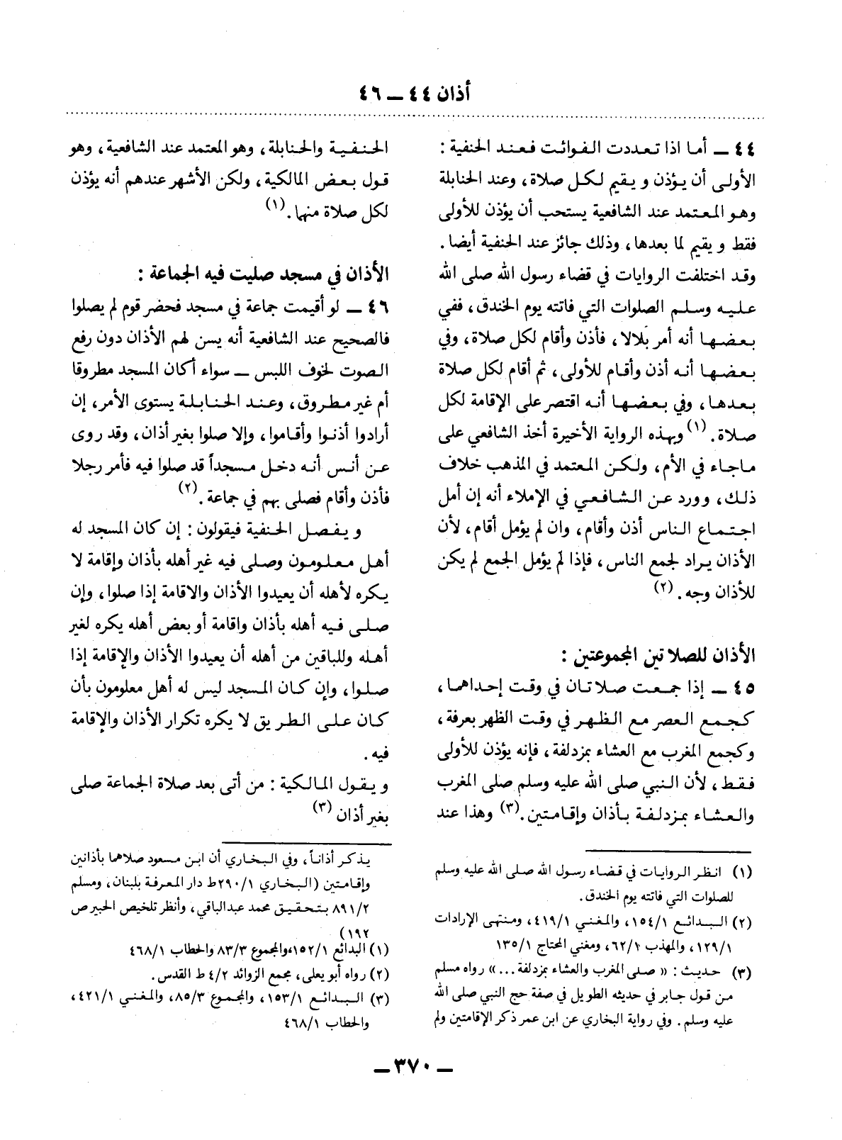 45 - إِذَا جُمِعَتْ صَلاَتَانِ فِي وَقْتِ إِحْدَاهُمَا، كَجَمْعِ الْعَصْرِ مَعَ الظُّهْرِ فِي وَقْتِ الظُّهْرِ بِعَرَفَةَ، وَكَجَمْعِ الْمَغْرِبِ مَعَ الْعِشَاءِ بِمُزْدَلِفَةَ، فَإِنَّهُ يُؤَذِّنُ لِلأُْولَى فَقَطْ؛ لأَِنَّ النَّبِيَّ صَلَّى اللَّهُ عَلَيْهِ وَسَلَّمَ صَلَّى الْمَغْرِبَ وَالْعِشَاءَ بِمُزْدَلِفَةَ بِأَذَانٍ وَإِقَامَتَيْنِ (3) . وَهَذَا عِنْدَ