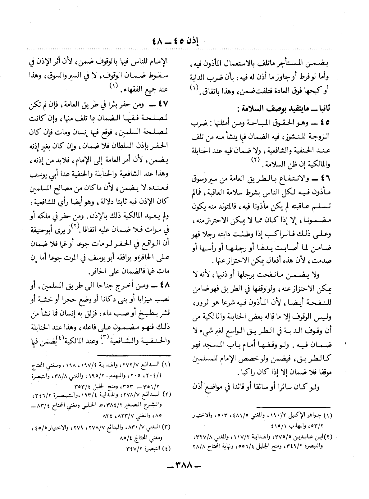 46 - وَالاِنْتِفَاعُ بِالطَّرِيقِ الْعَامَّةِ مِنْ سَيْرٍ وَسُوقٍ مَأْذُونٍ فِيهِ لِكُل النَّاسِ بِشَرْطِ سَلاَمَةِ الْعَاقِبَةِ، فَمَا لَمْ تَسْلَمْ عَاقِبَتُهُ لَمْ يَكُنْ مَأْذُونًا فِيهِ، فَالْمُتَوَلَّدُ مِنْهُ يَكُونُ مَضْمُونًا، إِلاَّ إِذَا كَانَ مِمَّا لاَ يُمْكِنُ الاِحْتِرَازُ مِنْهُ، وَعَلَى ذَلِكَ فَالرَّاكِبُ إِذَا وَطِئَتْ دَابَّتُهُ رَجُلاً فَهُوَ ضَامِنٌ لِمَا أَصَابَتْ يَدُهَا أَوْ رِجْلُهَا أَوْ رَأْسُهَا أَوْ صَدَمَتْ؛ لأَِنَّ هَذِهِ أَفْعَالٌ يُمْكِنُ الاِحْتِزَازُ عَنْهَا.