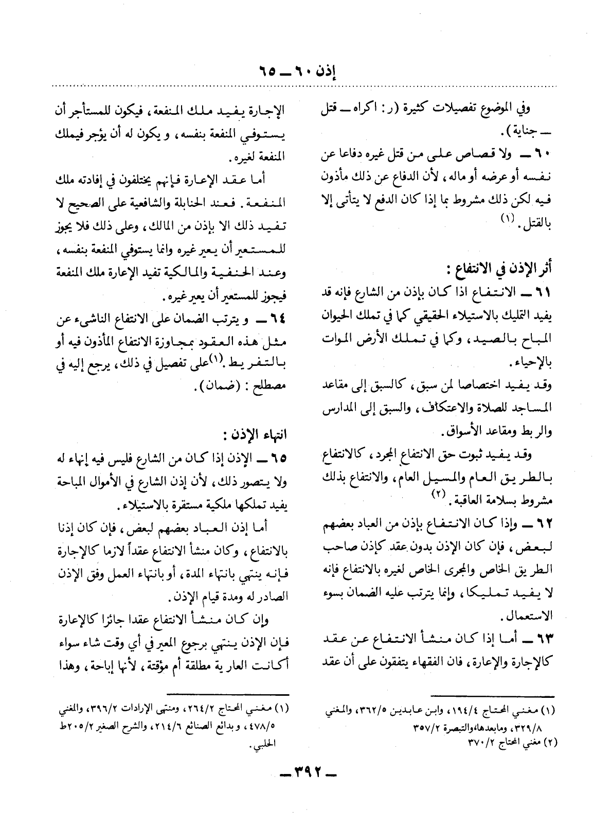 62 - وَإِذَا كَانَ الاِنْتِفَاعُ بِإِذْنٍ مِنَ الْعِبَادِ بَعْضُهُمْ لِبَعْضٍ، فَإِنْ كَانَ الإِْذْنُ بِدُونِ عَقْدٍ كَإِذْنِ صَاحِبِ الطَّرِيقِ الْخَاصِّ وَالْمَجْرَى الْخَاصِّ لِغَيْرِهِ بِالاِنْتِفَاعِ فَإِنَّهُ لاَ يُفِيدُ تَمْلِيكًا، وَإِنَّمَا يَتَرَتَّبُ عَلَيْهِ الضَّمَانُ بِسُوءِ الاِسْتِعْمَال.