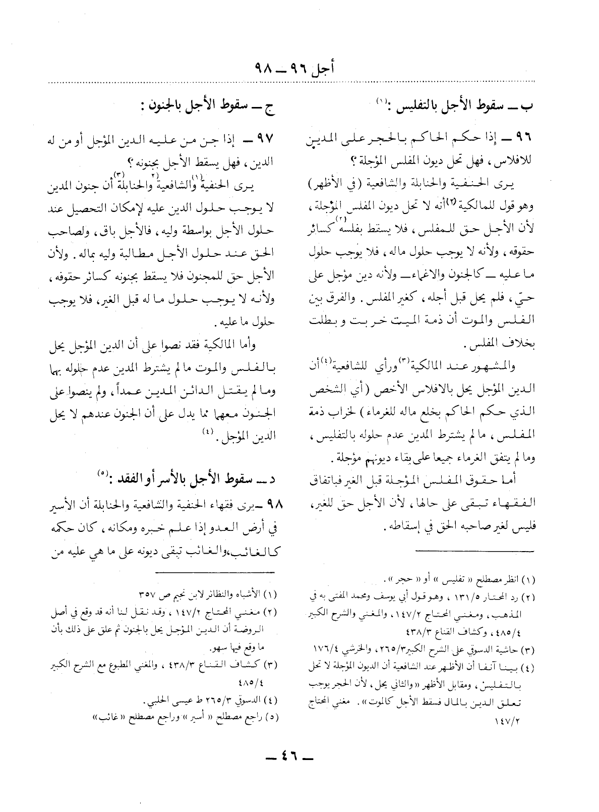 (2) مغني المحتاج 2 / 147، وقد نقل لنا أنه قد وقع في أصل الروضة أن الدين المؤجل يحل بالجنون ثم علق على ذلك بأن ما وقع فيها سهو.