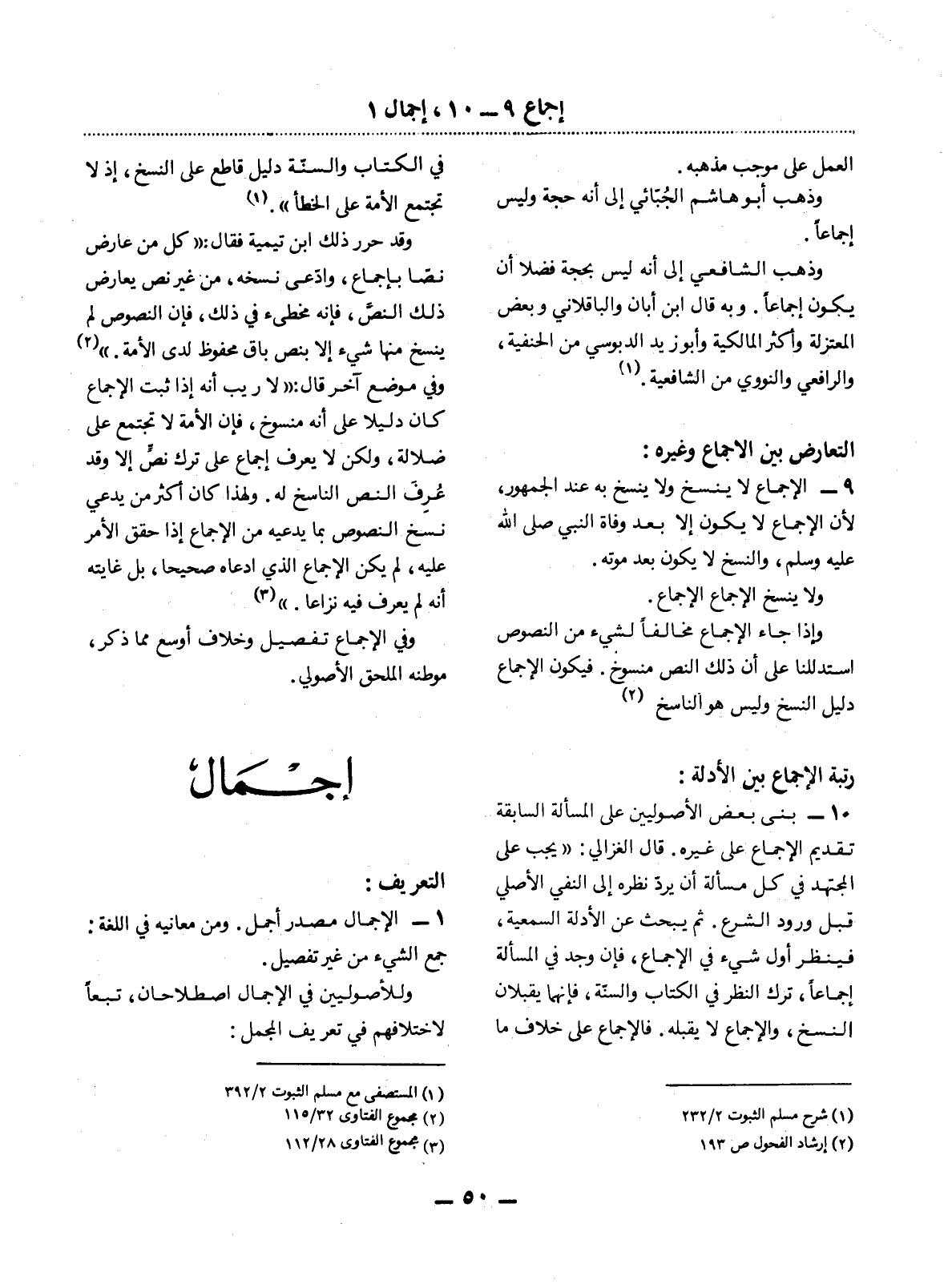 فِي الْكِتَابِ وَالسُّنَّةِ دَلِيلٌ قَاطِعٌ عَلَى النَّسْخِ، إِذْ لاَ تَجْتَمِعُ الأُْمَّةُ عَلَى الْخَطَأِ (1) ". وَقَدْ حَرَّرَ ذَلِكَ ابْنُ تَيْمِيَّةَ فَقَال " كُل مَنْ عَارَضَ نَصًّا بِإِجْمَاعٍ، وَادَّعَى نَسْخَهُ، مِنْ غَيْرِ نَصٍّ يُعَارِضُ ذَلِكَ النَّصَّ، فَإِنَّهُ مُخْطِئٌ فِي ذَلِكَ، فَإِنَّ النُّصُوصَ لَمْ يُنْسَخْ مِنْهَا شَيْءٌ إِلاَّ بِنَصٍّ بَاقٍ مَحْفُوظٍ لَدَى الأُْمَّةِ (2) . " وَفِي مَوْضِعٍ آخَرَ قَال " لاَ رَيْبَ أَنَّهُ إِذَا ثَبَتَ الإِْجْمَاعُ كَانَ دَلِيلاً عَلَى أَنَّهُ مَنْسُوخٌ، فَإِنَّ الأُْمَّةَ لاَ تَجْتَمِعُ عَلَى ضَلاَلَةٍ، وَلَكِنْ لاَ يُعْرَفُ إِجْمَاعٌ عَلَى تَرْكِ نَصٍّ إِلاَّ وَقَدْ عُرِفَ النَّصُّ النَّاسِخُ لَهُ، وَلِهَذَا كَانَ أَكْثَرُ مَنْ يَدَّعِي نَسْخَ النُّصُوصِ بِمَا يَدَّعِيهِ مِنَ الإِْجْمَاعِ إِذَا حَقَّقَ الأَْمْرَ عَلَيْهِ، لَمْ يَكُنِ الإِْجْمَاعُ الَّذِي ادَّعَاهُ صَحِيحًا، بَل غَايَتُهُ أَنَّهُ لَمْ يَعْرِفْ فِيهِ نِزَاعًا. " (3) وَفِي الإِْجْمَاعِ تَفْصِيلٌ وَخِلاَفٌ أَوْسَعُ مِمَّا ذُكِرَ، مَوْطِنُهُ الْمُلْحَقُ الأُْصُولِيُّ.