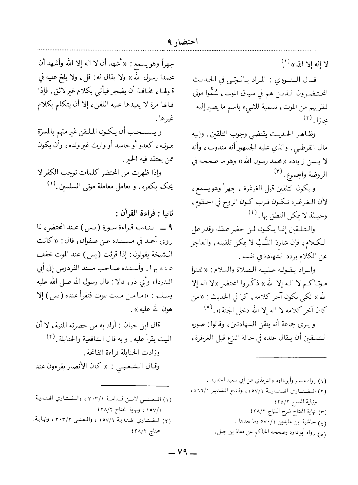 9 - يُنْدَبُ قِرَاءَةُ سُورَةِ (يس) عِنْدَ الْمُحْتَضَرِ، لِمَا رَوَى أَحْمَدُ فِي مُسْنَدِهِ عَنْ صَفْوَانَ، قَال: " كَانَتِ الْمَشْيَخَةُ يَقُولُونَ: إِذَا قُرِئَتْ (يس) عِنْدَ الْمَوْتِ خُفِّفَ عَنْهُ بِهَا. وَأَسْنَدَهُ صَاحِبُ مُسْنَدِ الْفِرْدَوْسِ إِلَى أَبِي الدَّرْدَاءِ وَأَبِي ذَرٍّ، قَالاَ: قَال رَسُول اللَّهِ صَلَّى اللَّهُ عَلَيْهِ وَسَلَّمَ: مَا مِنْ مَيِّتٍ يَمُوتُ فَتُقْرَأُ عِنْدَهُ يس إِلاَّ هَوَّنَ اللَّهُ عَلَيْهِ.