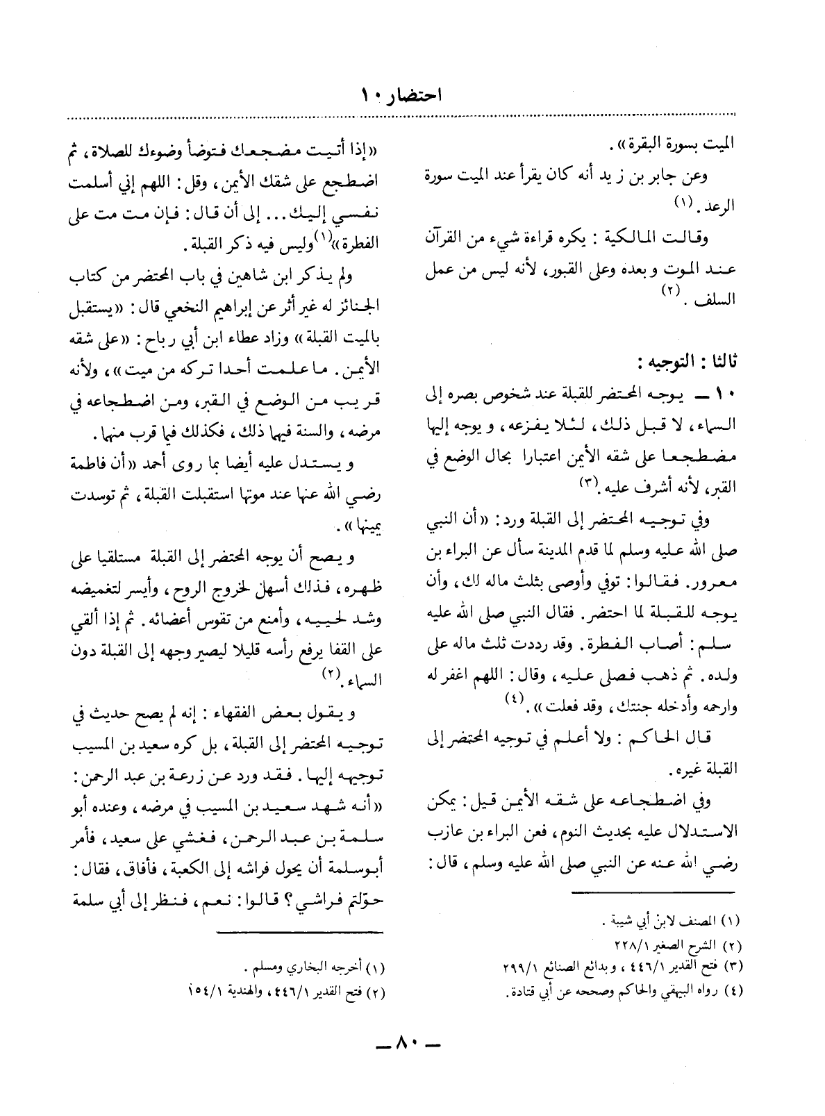 10 - يُوَجَّهُ الْمُحْتَضَرُ لِلْقِبْلَةِ عِنْدَ شُخُوصِ بَصَرِهِ إِلَى السَّمَاءِ، لاَ قَبْل ذَلِكَ، لِئَلاَّ يُفْزِعَهُ، وَيُوَجَّهُ إِلَيْهَا مُضْطَجِعًا عَلَى شِقِّهِ الأَْيْمَنِ اعْتِبَارًا بِحَال الْوَضْعِ فِي الْقَبْرِ؛ لأَِنَّهُ أَشْرَفُ عَلَيْهِ (3) . وَفِي تَوْجِيهِ الْمُحْتَضَرِ إِلَى الْقِبْلَةِ وَرَدَ: أَنَّ النَّبِيَّ صَلَّى اللَّهُ عَلَيْهِ وَسَلَّمَ لَمَّا قَدِمَ الْمَدِينَةَ سَأَل عَنِ الْبَرَاءِ بْنِ مَعْرُورٍ. فَقَالُوا: تُوُفِّيَ وَأَوْصَى بِثُلُثِ مَالِهِ لَكَ، وَأَنْ يُوَجَّهَ لِلْقِبْلَةِ لَمَّا احْتُضِرَ. فَقَال النَّبِيُّ صَلَّى اللَّهُ عَلَيْهِ وَسَلَّمَ: أَصَابَ الْفِطْرَةَ، وَقَدْ رَدَدْتُ ثُلُثَ مَالِهِ عَلَى وَلَدِهِ، ثُمَّ ذَهَبَ فَصَلَّى عَلَيْهِ، وَقَال: اللَّهُمَّ اغْفِرْ لَهُ وَارْحَمْهُ وَأَدْخِلْهُ جَنَّتَكَ، وَقَدْ فَعَلْتَ (4) . قَال الْحَاكِمُ: وَلاَ أَعْلَمُ فِي تَوْجِيهِ الْمُحْتَضَرِ إِلَى الْقِبْلَةِ غَيْرَهُ.
