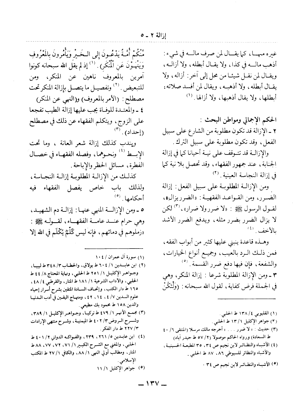 مِنْكُمْ أُمَّةٌ يَدْعُونَ إِلَى الْخَيْرِ وَيَأْمُرُونَ بِالْمَعْرُوفِ وَيَنْهَوْنَ عَنِ الْمُنْكَرِ} . (1) إِذْ لَمْ يَقُل اللَّهُ سُبْحَانَهُ كُونُوا آمِرِينَ بِالْمَعْرُوفِ نَاهِينَ عَنِ الْمُنْكَرِ، وَمِنْ لِلتَّبْعِيضِ (2) . وَتَفْصِيل مَا يَتَّصِل بِإِزَالَةِ الْمُنْكَرِ تَحْتَ مُصْطَلَحِ: (الأَْمْرُ بِالْمَعْرُوفِ) (وَالنَّهْيُ عَنِ الْمُنْكَرِ)