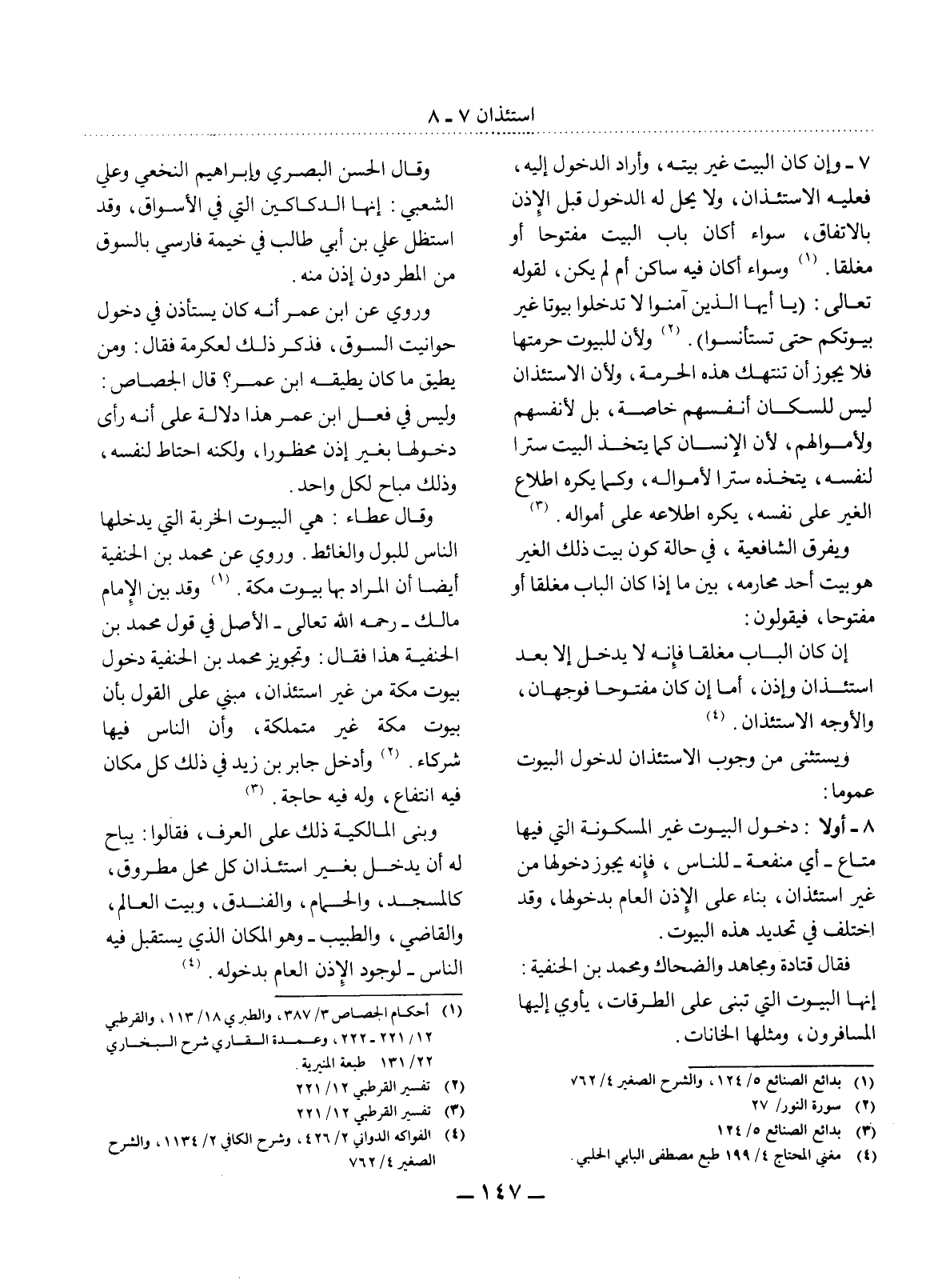 7 - وَإِنْ كَانَ الْبَيْتُ غَيْرَ بَيْتِهِ، وَأَرَادَ الدُّخُول إِلَيْهِ، فَعَلَيْهِ الاِسْتِئْذَانُ، وَلاَ يَحِل لَهُ الدُّخُول قَبْل الإِْذْنِ بِالاِتِّفَاقِ، سَوَاءٌ أَكَانَ بَابُ الْبَيْتِ مَفْتُوحًا أَوْ مُغْلَقًا (1) . وَسَوَاءٌ أَكَانَ فِيهِ سَاكِنٌ أَمْ لَمْ يَكُنْ، لِقَوْلِهِ تَعَالَى: {يَا أَيُّهَا الَّذِينَ آمَنُوا لاَ تَدْخُلُوا بُيُوتًا غَيْرَ بُيُوتِكُمْ حَتَّى تَسْتَأْنِسُوا} . (2) وَلأَِنَّ لِلْبُيُوتِ حُرْمَتَهَا فَلاَ يَجُوزُ أَنْ تُنْتَهَكَ هَذِهِ الْحُرْمَةُ؛ وَلأَِنَّ الاِسْتِئْذَانَ لَيْسَ لِلسُّكَّانِ أَنْفُسِهِمْ خَاصَّةً، بَل لأَِنْفُسِهِمْ وَلأَِمْوَالِهِمْ؛ لأَِنَّ الإِْنْسَانَ كَمَا يَتَّخِذُ الْبَيْتَ سِتْرًا لِنَفْسِهِ، يَتَّخِذُهُ سِتْرًا لأَِمْوَالِهِ، وَكَمَا يَكْرَهُ اطِّلاَعَ الْغَيْرِ عَلَى نَفْسِهِ، يَكْرَهُ اطِّلاَعَهُ عَلَى أَمْوَالِهِ (3) .