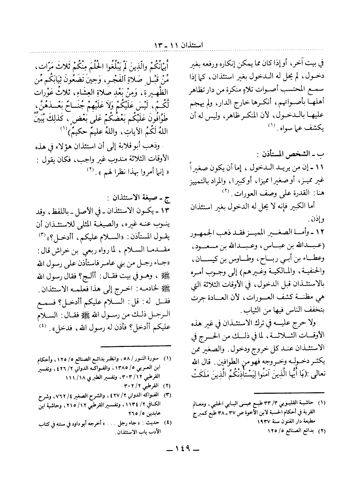 (1) سورة النور / 58، وانظر بدائع الصنائع 5 / 125، وأحكام ابن العربي 5 / 1385، والفواكه الدواني 2 / 426، وتفسير القرطبي 12 / 303، وتفسير الطبري 18 / 111