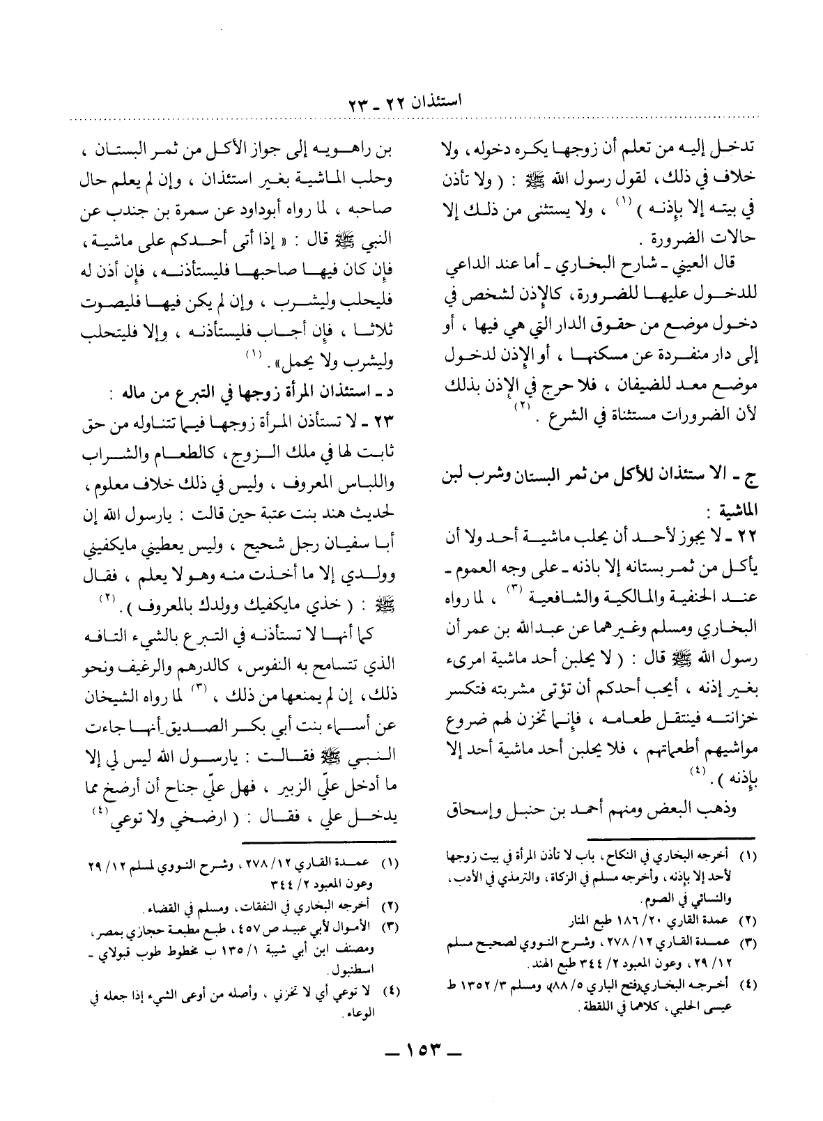 23 - لاَ تَسْتَأْذِنُ الْمَرْأَةُ زَوْجَهَا فِيمَا تَتَنَاوَلُهُ مِنْ حَقٍّ ثَابِتٍ لَهَا فِي مِلْكِ الزَّوْجِ، كَالطَّعَامِ وَالشَّرَابِ وَاللِّبَاسِ الْمَعْرُوفِ، وَلَيْسَ فِي ذَلِكَ خِلاَفٌ مَعْلُومٌ، لِحَدِيثِ هِنْدِ بِنْتِ عُتْبَةَ حِينَ قَالَتْ: يَا رَسُول اللَّهِ إِنَّ أَبَا سُفْيَانَ رَجُلٌ شَحِيحٌ، وَلَيْسَ يُعْطِينِي مَا يَكْفِينِي وَوَلَدِي إِلاَّ مَا أَخَذْتُ مِنْهُ وَهُوَ لاَ يَعْلَمُ، فَقَال صَلَّى اللَّهُ عَلَيْهِ وَسَلَّمَ: خُذِي مَا يَكْفِيكِ وَوَلَدَكِ بِالْمَعْرُوفِ. (2)