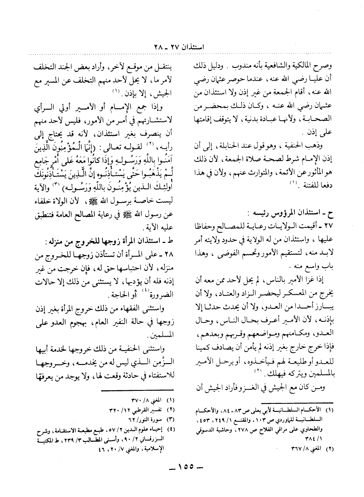 27 - أُقِيمَتِ الْوِلاَيَاتُ رِعَايَةً لِلْمَصَالِحِ وَحِفَاظًا عَلَيْهَا، وَاسْتِئْذَانُ مَنْ لَهُ الْوِلاَيَةُ فِي حُدُودِ وِلاَيَتِهِ أَمْرٌ لاَ بُدَّ مِنْهُ؛ لِتَسْتَقِيمَ الأُْمُورُ وَتُحْسَمَ الْفَوْضَى، وَهَذَا بَابٌ وَاسِعٌ مِنْهُ.