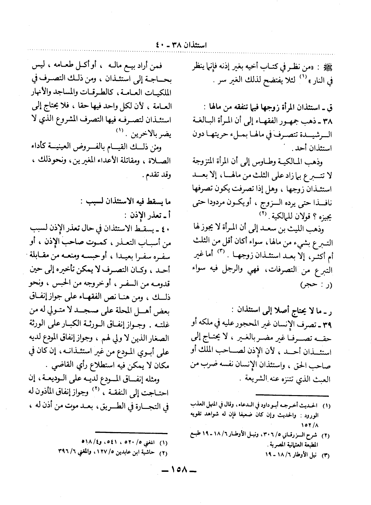 39 - تَصَرُّفُ الإِْنْسَانِ غَيْرِ الْمَحْجُورِ عَلَيْهِ فِي مِلْكِهِ أَوْ حَقِّهِ تَصَرُّفًا غَيْرَ مُضِرٍّ بِالْغَيْرِ، لاَ يَحْتَاجُ إِلَى اسْتِئْذَانِ أَحَدٍ؛ لأَِنَّ الإِْذْنَ لِصَاحِبِ الْمِلْكِ أَوْ صَاحِبِ الْحَقِّ، وَاسْتِئْذَانُ الإِْنْسَانِ نَفْسَهُ ضَرْبٌ مِنَ الْعَبَثِ الَّذِي تَتَنَزَّهُ عَنْهُ الشَّرِيعَةُ.