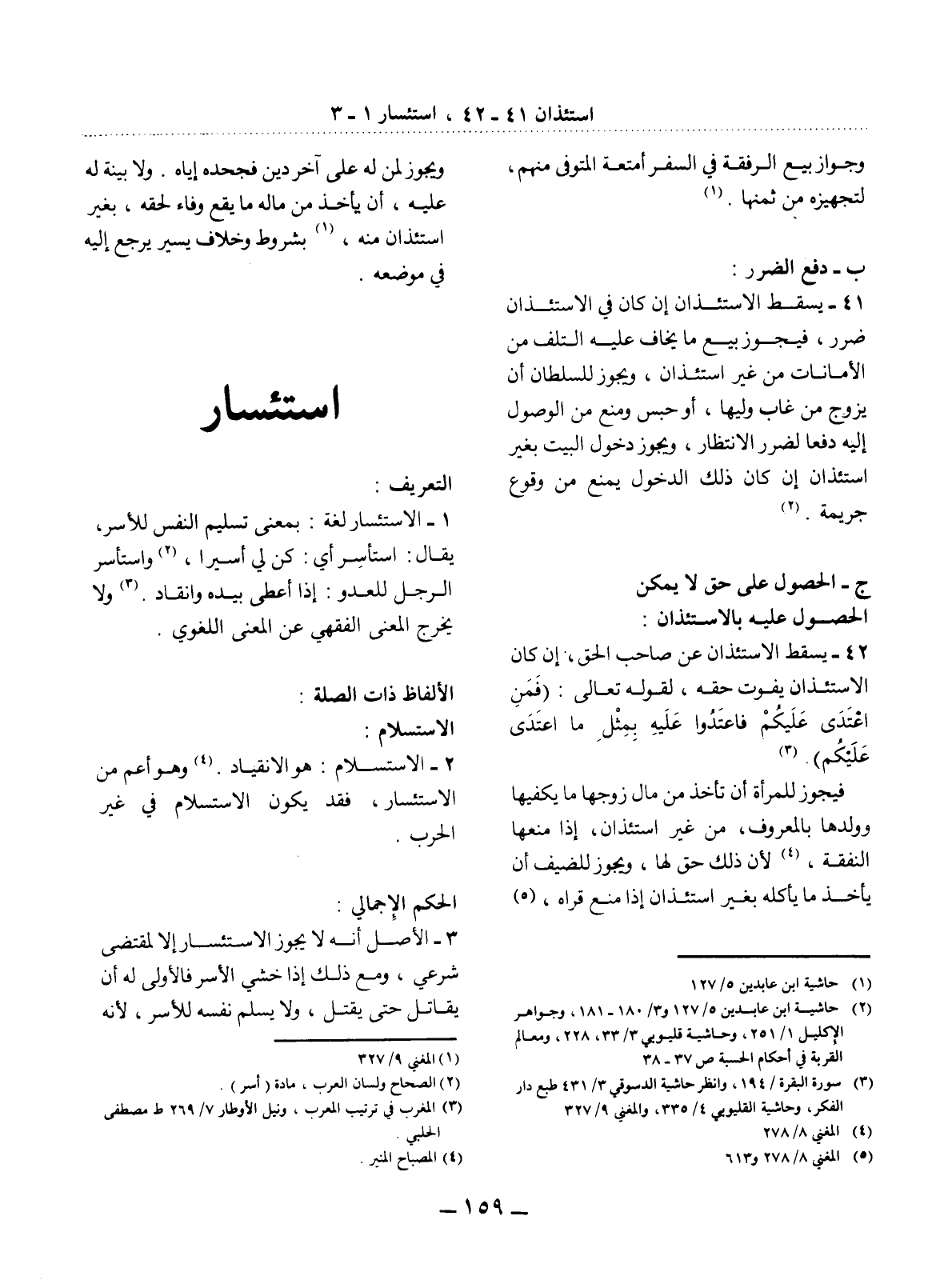 42 - يَسْقُطُ الاِسْتِئْذَانُ عَنْ صَاحِبِ الْحَقِّ، إِنْ كَانَ الاِسْتِئْذَانُ يُفَوِّتُ حَقَّهُ، لِقَوْلِهِ تَعَالَى: {فَمَنْ اعْتَدَى عَلَيْكُمْ فَاعْتَدُوا عَلَيْهِ بِمِثْل مَا اعْتَدَى عَلَيْكُمْ} . (3)