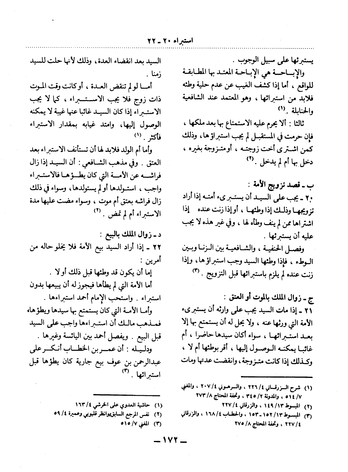 20 - يَجِبُ عَلَى السَّيِّدِ أَنْ يَسْتَبْرِئَ أَمَتَهُ إِذَا أَرَادَ تَزْوِيجَهَا وَذَلِكَ إِذَا وَطِئَهَا، أَوْ إِذَا زَنَتْ عِنْدَهُ إِذَا اشْتَرَاهَا مِمَّنْ لَمْ يَنْفِ وَطْأَهُ لَهَا، وَفِي غَيْرِ هَذِهِ لاَ يَجِبُ عَلَيْهِ أَنْ يَسْتَبْرِئَهَا.