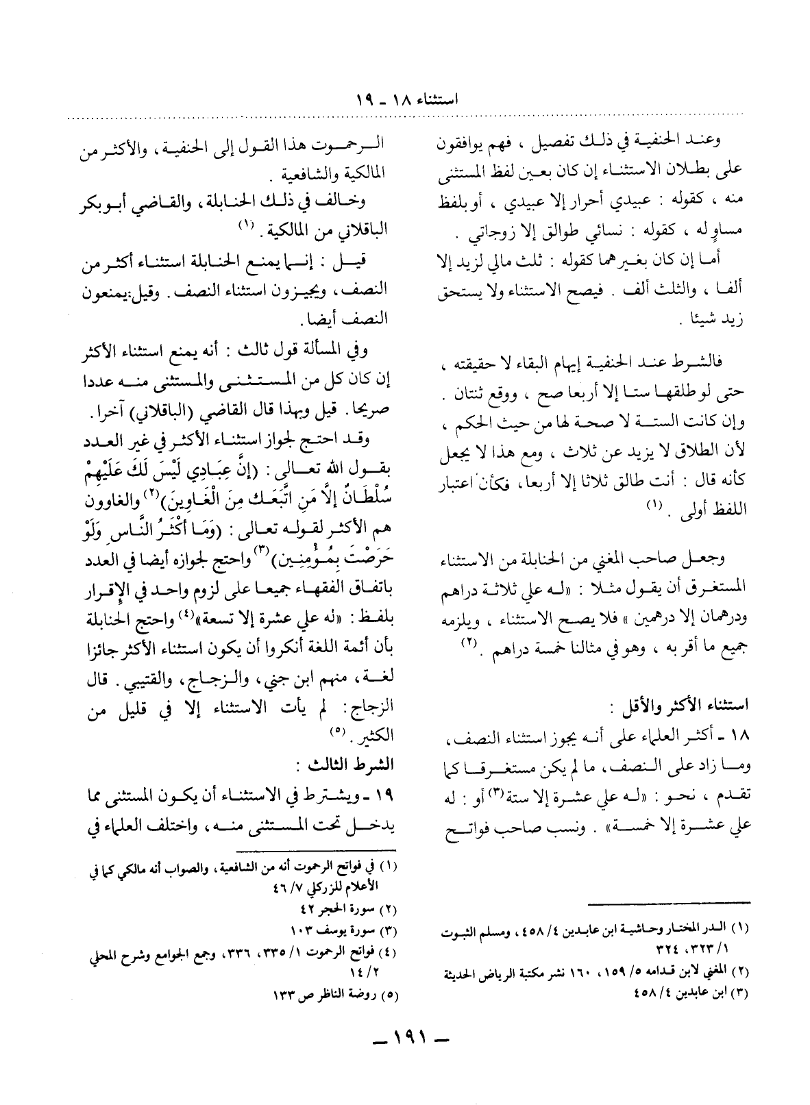 18 - أَكْثَرُ الْعُلَمَاءِ عَلَى أَنَّهُ يَجُوزُ اسْتِثْنَاءُ النِّصْفِ، وَمَا زَادَ عَلَى النِّصْفِ، مَا لَمْ يَكُنْ مُسْتَغْرِقًا كَمَا تَقَدَّمَ، نَحْوُ: " لَهُ عَلَيَّ عَشَرَةٌ إِلاَّ سِتَّةً (3) أَوْ: لَهُ عَلَيَّ عَشَرَةٌ إِلاَّ خَمْسَةً ". وَنَسَبَ صَاحِبُ فَوَاتِحِ