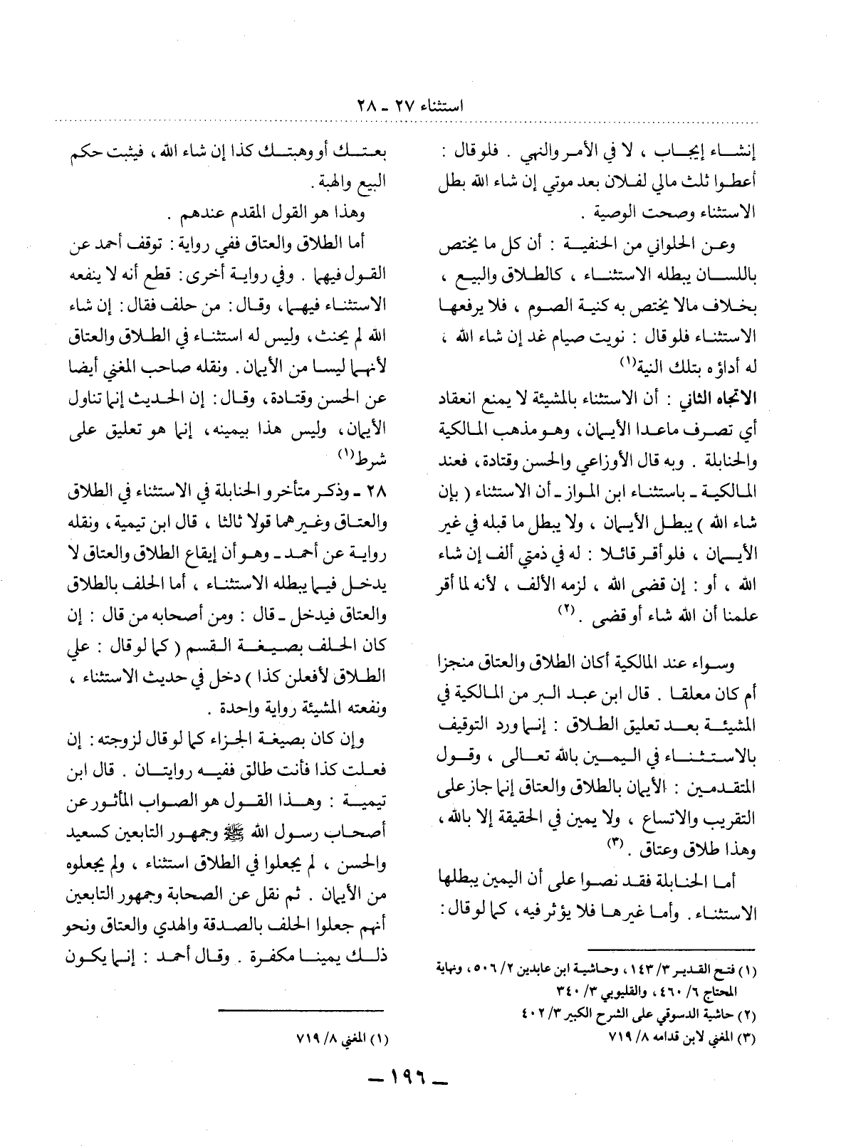 28 - وَذَكَرَ مُتَأَخِّرُو الْحَنَابِلَةِ فِي الاِسْتِثْنَاءِ فِي الطَّلاَقِ وَالْعَتَاقِ وَغَيْرِهِمَا قَوْلاً ثَالِثًا، قَال ابْنُ تَيْمِيَّةَ، وَنَقَلَهُ رِوَايَةً عَنْ أَحْمَدَ - وَهُوَ أَنَّ إِيقَاعَ الطَّلاَقِ وَالْعَتَاقِ لاَ يَدْخُل فِيمَا يُبْطِلُهُ الاِسْتِثْنَاءُ، أَمَّا الْحَلِفُ بِالطَّلاَقِ وَالْعَتَاقِ فَيَدْخُل - قَال: وَمِنْ أَصْحَابِهِ مَنْ قَال: إِنْ كَانَ الْحَلِفُ بِصِيغَةِ الْقَسَمِ (كَمَا لَوْ قَال: عَلَيَّ الطَّلاَقُ لأََفْعَلَنَّ كَذَا) دَخَل فِي حَدِيثِ الاِسْتِثْنَاءِ، وَنَفَعَتْهُ الْمَشِيئَةُ رِوَايَةٌ وَاحِدَةٌ.