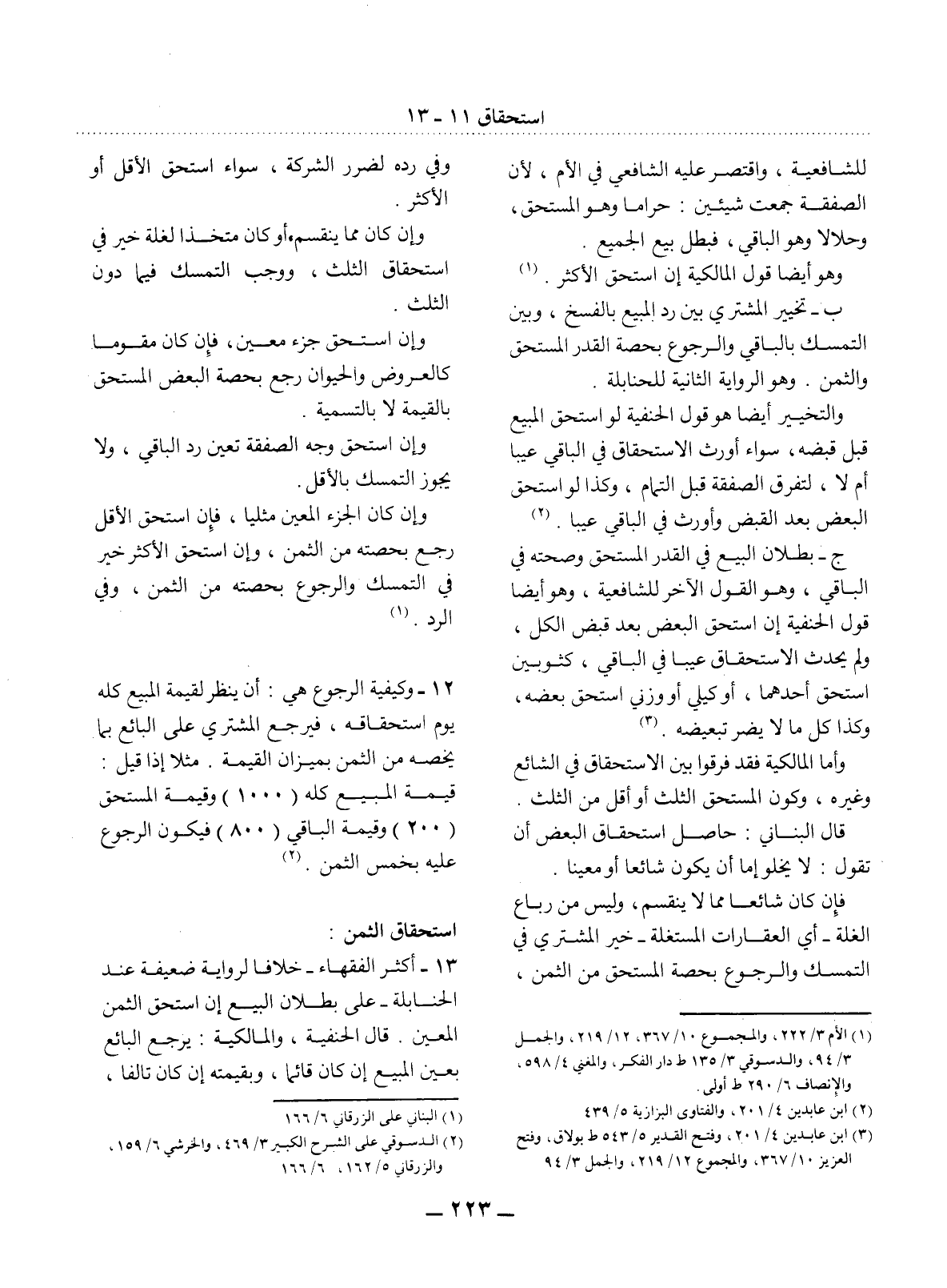 12 - وَكَيْفِيَّةِ الرُّجُوعِ هِيَ: أَنْ يَنْظُرَ لِقِيمَةِ الْمَبِيعِ كُلِّهِ يَوْمَ اسْتِحْقَاقِهِ، فَيَرْجِعُ الْمُشْتَرِي عَلَى الْبَائِعِ بِمَا يَخُصُّهُ مِنَ الثَّمَنِ بِمِيزَانِ الْقِيمَةِ. مَثَلاً إِذَا قِيل: قِيمَةُ الْمَبِيعِ كُلِّهِ (1000) وَقِيمَةُ الْمُسْتَحَقِّ (200) وَقِيمَةُ الْبَاقِي (800) فَيَكُونُ الرُّجُوعُ عَلَيْهِ بِخُمُسِ الثَّمَنِ (2) .
