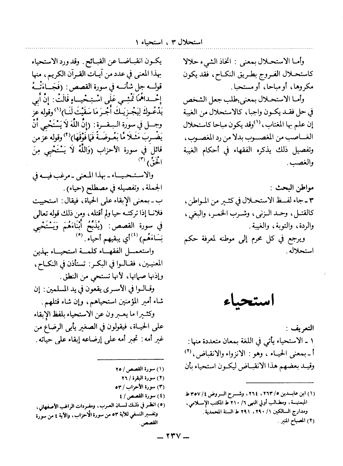 يَكُونَ انْقِبَاضًا عَنِ الْقَبَائِحِ. وَقَدْ وَرَدَ الاِسْتِحْيَاءُ بِهَذَا الْمَعْنَى فِي عَدَدٍ مِنْ آيَاتِ الْقُرْآنِ الْكَرِيمِ، مِنْهَا قَوْلُهُ جَل شَأْنُهُ فِي سُورَةِ الْقَصَصِ: {فَجَاءَتْهُ إِحْدَاهُمَا تَمْشِي عَلَى اسْتِحْيَاءٍ قَالَتْ إِنَّ أَبِي يَدْعُوَك لِيَجْزِيَكَ أَجْرَ مَا سَقَيْتَ لَنَا} (1) وَقَوْلُهُ عَزَّ وَجَل فِي سُورَةِ الْبَقَرَةِ: {إِنَّ اللَّهَ لاَ يَسْتَحْيِي أَنْ يَضْرِبَ مَثَلاً مَا بَعُوضَةً فَمَا فَوْقَهَا} (2) وَقَوْلُهُ عَزَّ مِنْ قَائِلٍ فِي سُورَةِ الأَْحْزَابِ {وَاَللَّهُ لاَ يَسْتَحْيِي مِنَ الْحَقِّ} (3)