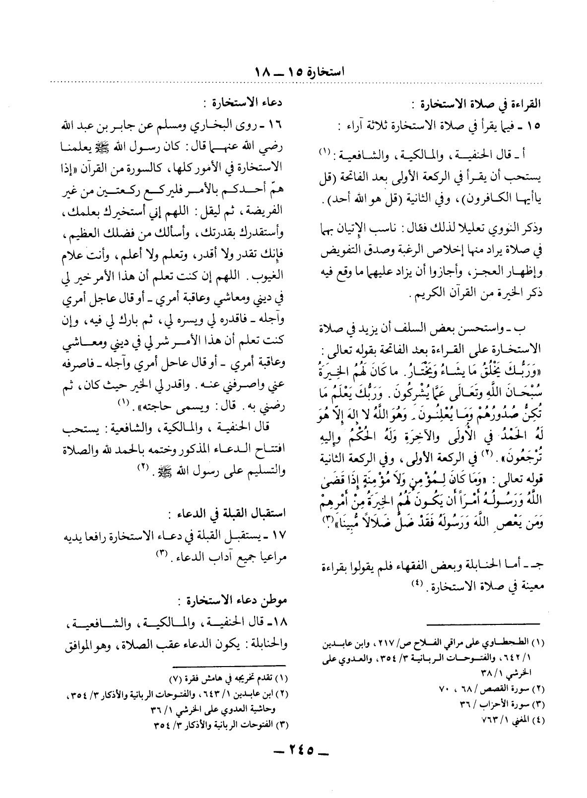 16 - رَوَى الْبُخَارِيُّ وَمُسْلِمٌ عَنْ جَابِرِ بْنِ عَبْدِ اللَّهِ رَضِيَ اللَّهُ عَنْهُمَا قَال: كَانَ رَسُول اللَّهِ صَلَّى اللَّهُ عَلَيْهِ وَسَلَّمَ يُعَلِّمُنَا الاِسْتِخَارَةَ فِي الأُْمُورِ كُلِّهَا، كَالسُّورَةِ مِنَ الْقُرْآنِ إِذَا هَمَّ أَحَدُكُمْ بِالأَْمْرِ فَلْيَرْكَعْ رَكْعَتَيْنِ مِنْ غَيْرِ الْفَرِيضَةِ، ثُمَّ لِيُقَل: اللَّهُمَّ إِنِّي أَسْتَخِيرُكَ بِعِلْمِكَ، وَأَسْتَقْدِرُكَ بِقُدْرَتِكَ، وَأَسْأَلُكَ مِنْ فَضْلِك الْعَظِيمِ، فَإِنَّكَ تَقْدِرُ وَلاَ أَقْدِرُ، وَتَعْلَمُ وَلاَ أَعْلَمُ، وَأَنْتَ عَلاَّمُ الْغُيُوبِ. اللَّهُمَّ إِنْ كُنْتَ تَعْلَمُ أَنَّ هَذَا الأَْمْرَ خَيْرٌ لِي فِي دِينِي وَمَعَاشِي وَعَاقِبَةِ أَمْرِي - أَوْ قَال عَاجِل أَمْرِي وَآجِلِهِ - فَاقْدُرْهُ لِي وَيَسِّرْهُ لِي، ثُمَّ بَارِكْ لِي فِيهِ، وَإِنْ كُنْتَ تَعْلَمُ أَنَّ هَذَا الأَْمْرَ شَرٌّ لِي فِي دِينِي وَمَعَاشِي وَعَاقِبَةِ أَمْرِي - أَوْ قَال عَاجِل أَمْرِي وَآجِلِهِ - فَاصْرِفْهُ عَنِّي وَاصْرِفْنِي عَنْهُ. وَاقْدُرْ لِي الْخَيْرَ حَيْثُ كَانَ، ثُمَّ رَضِّنِي بِهِ. قَال: وَيُسَمِّي حَاجَتَهُ. (1)
