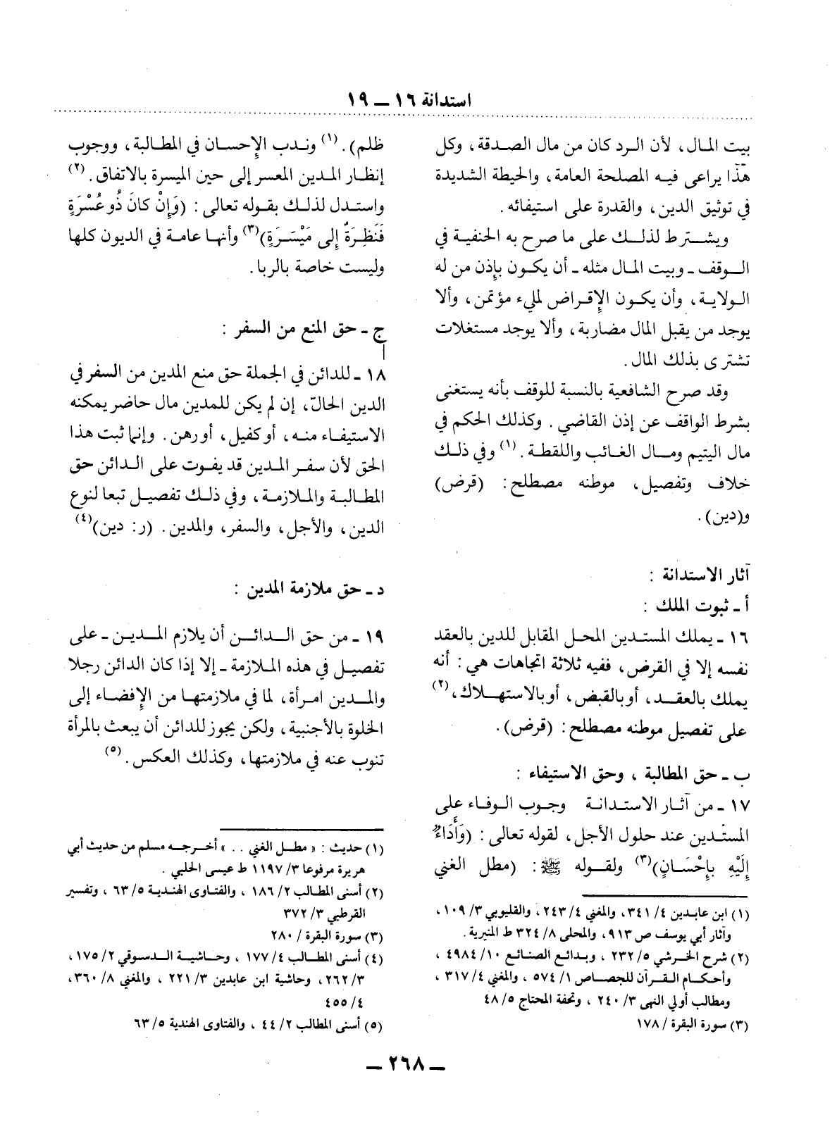 17 - مِنْ آثَارِ الاِسْتِدَانَةِ وُجُوبُ الْوَفَاءِ عَلَى الْمُسْتَدِينِ عِنْدَ حُلُول الأَْجَل، لِقَوْلِهِ تَعَالَى: {وَأَدَاءٌ إِلَيْهِ بِإِحْسَانٍ} (3) وَلِقَوْلِهِ صَلَّى اللَّهُ عَلَيْهِ وَسَلَّمَ: مَطْل الْغَنِيِّ