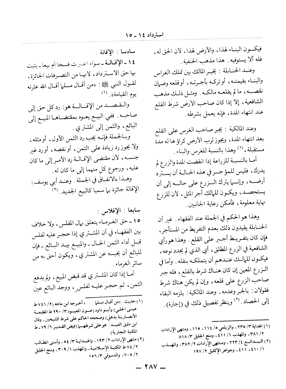 (1) حديث: " من أقال مسلما. . . " أخرجه ابن ماجه (2 / 741 ط عيسى الحلبي) وأبو داود (عون المعبود 3 / 290 ط المطبعة الأنصارية بدهلي) وصححه الحاكم على شرط الشيخين، وقال ابن دقيق العيد: هو على شرطهما (فيض القدير 6 / 79 - ط المكتبة التجارية) .