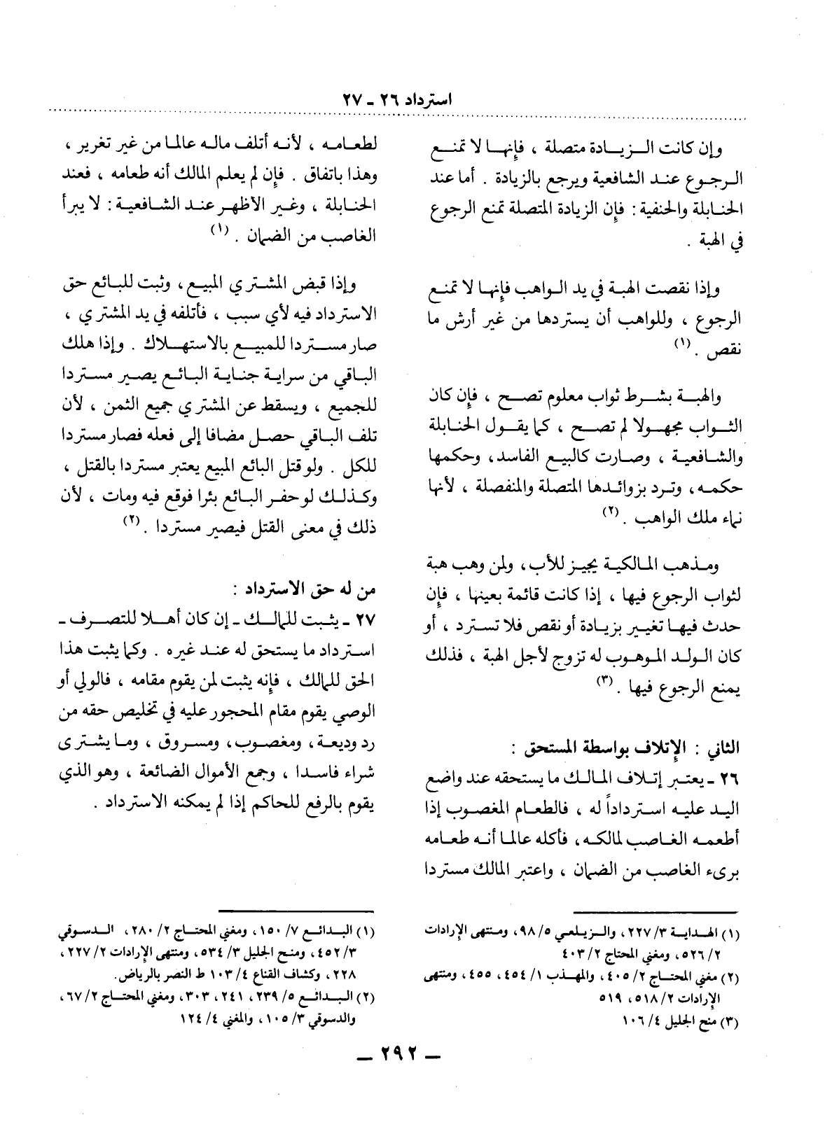 26 - يُعْتَبَرُ إِتْلاَفُ الْمَالِكِ مَا يَسْتَحِقُّهُ عِنْدَ وَاضِعِ الْيَدِ عَلَيْهِ اسْتِرْدَادًا لَهُ، فَالطَّعَامُ الْمَغْصُوبُ إِذَا أَطْعَمَهُ الْغَاصِبُ لِمَالِكِهِ، فَأَكَلَهُ عَالِمًا أَنَّهُ طَعَامُهُ بَرِئَ الْغَاصِبُ مِنَ الضَّمَانِ، وَاعْتُبِرَ الْمَالِكُ مُسْتَرِدًّا