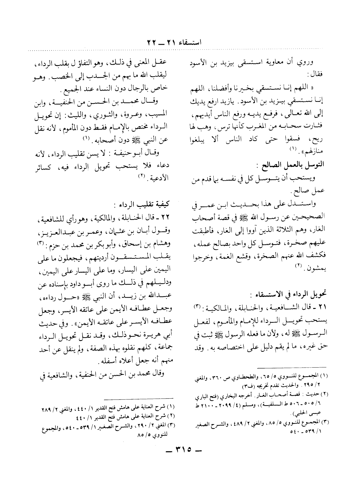 22 - قَال الْحَنَابِلَةُ، وَالْمَالِكِيَّةُ، وَهُوَ رَأْيٌ لِلشَّافِعِيَّةِ، وَقَوْل أَبَانَ بْنِ عُثْمَانَ، وَعُمَرَ بْنِ عَبْدِ الْعَزِيزِ، وَهِشَامِ بْنِ إِسْحَاقَ، وَأَبُو بَكْرِ بْنُ مُحَمَّدِ بْنِ حَزْمٍ (3) : يَقْلِبُ الْمُسْتَسْقُونَ أَرْدِيَتَهُمْ، فَيَجْعَلُونَ مَا عَلَى الْيَمِينِ عَلَى الْيَسَارِ، وَمَا عَلَى الْيَسَارِ عَلَى الْيَمِينِ، وَدَلِيلُهُمْ فِي ذَلِكَ مَا رَوَى أَبُو دَاوُدَ بِإِسْنَادِهِ عَنْ عَبْدِ اللَّهِ بْنِ زَيْدٍ، أَنَّ النَّبِيَّ صَلَّى اللَّهُ عَلَيْهِ وَسَلَّمَ حَوَّل رِدَاءَهُ، وَجَعَل عِطَافَهُ الأَْيْمَنَ عَلَى عَاتِقِهِ الأَْيْسَرِ، وَجَعَل عِطَافَهُ الأَْيْسَرَ عَلَى عَاتِقِهِ الأَْيْمَنِ. وَفِي حَدِيثِ أَبِي هُرَيْرَةَ نَحْوُ ذَلِكَ، وَقَدْ نَقَل تَحْوِيل الرِّدَاءِ جَمَاعَةٌ، كُلُّهُمْ نَقَلُوهُ بِهَذِهِ الصِّفَةِ، وَلَمْ يُنْقَل عَنْ أَحَدٍ مِنْهُمْ أَنَّهُ جَعَل أَعْلاَهُ أَسْفَلَهُ.