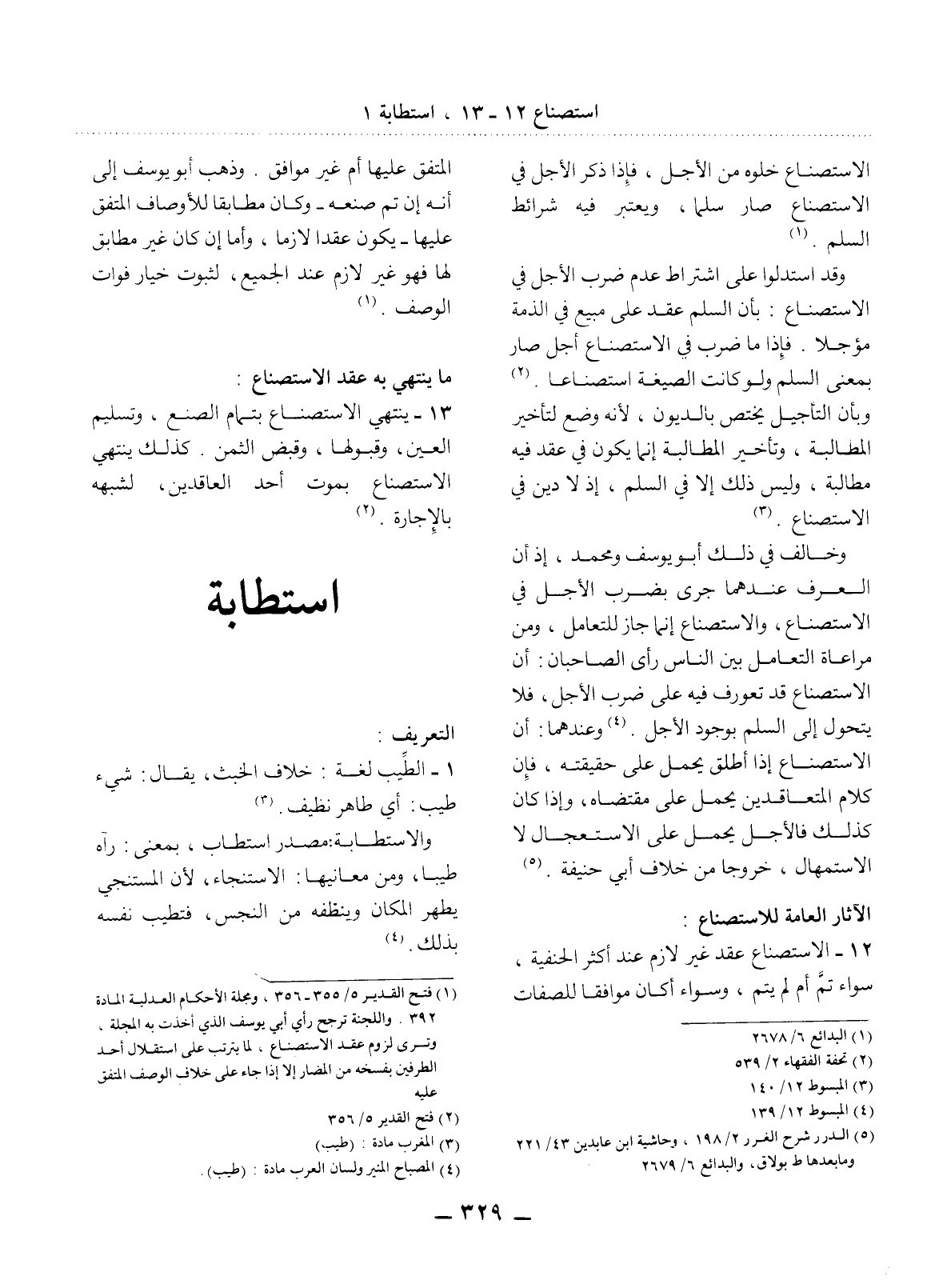 (1) فتح القدير 5 / 355 - 356، ومجلة الأحكام العدلية المادة 392. واللجنة ترجح رأي أبي يوسف الذي أخذت به المجلة، وترى لزوم عقد الاستصناع، لما يترتب على استقلال أحد الطرفين بفسخه من المضار إلا إذا جاء على خلاف الوصف المتفق عليه