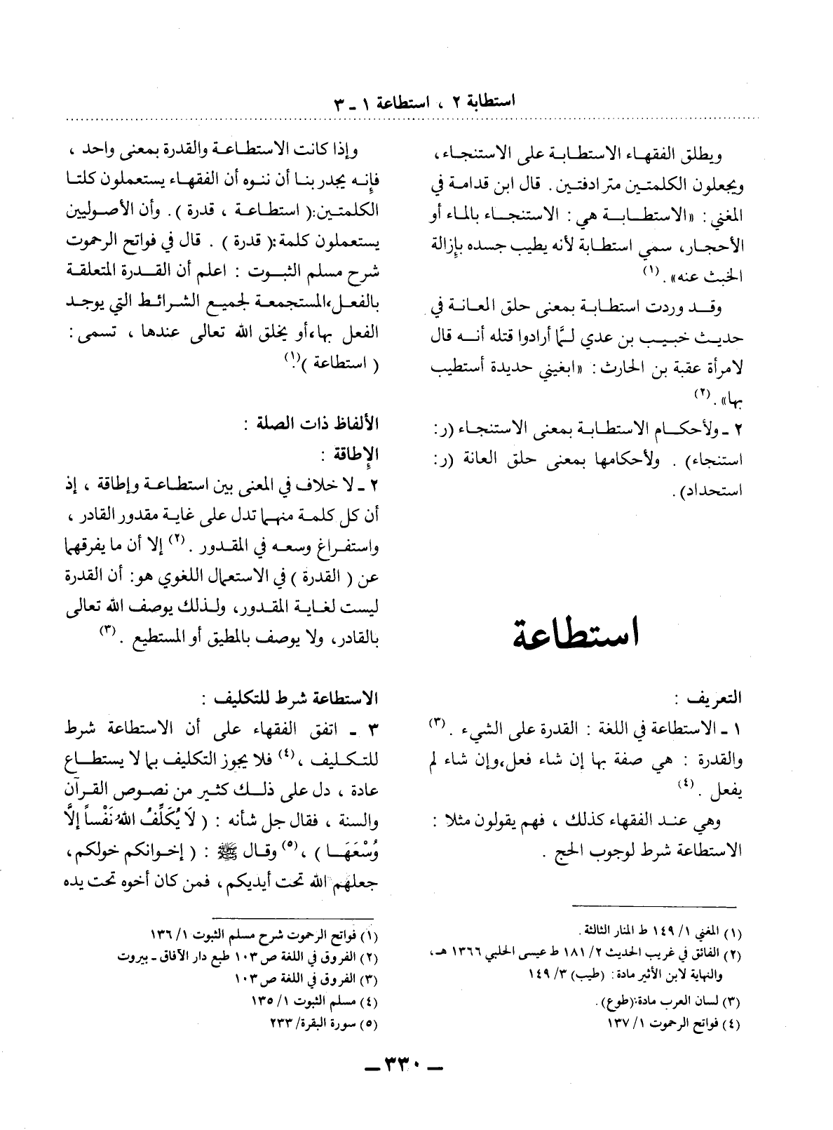 وَإِذَا كَانَتِ الاِسْتِطَاعَةُ وَالْقُدْرَةُ بِمَعْنًى وَاحِدٍ، فَإِنَّهُ يَجْدُرُ بِنَا أَنْ نُنَوِّهَ أَنَّ الْفُقَهَاءَ يَسْتَعْمِلُونَ كِلْتَا الْكَلِمَتَيْنِ: (اسْتِطَاعَةٌ، قُدْرَةٌ) . وَأَنَّ الأُْصُولِيِّينَ يَسْتَعْمِلُونَ كَلِمَةَ: (قُدْرَةٌ) . قَال فِي فَوَاتِحِ الرَّحَمُوتِ شَرْحِ مُسَلَّمِ الثُّبُوتِ: اعْلَمْ أَنَّ الْقُدْرَةَ الْمُتَعَلِّقَةَ بِالْفِعْل، الْمُسْتَجْمِعَةَ لِجَمِيعِ الشَّرَائِطِ الَّتِي يُوجَدُ الْفِعْل بِهَا، أَوْ يَخْلُقُ اللَّهُ تَعَالَى عِنْدَهَا، تُسَمَّى: (اسْتِطَاعَةً) .