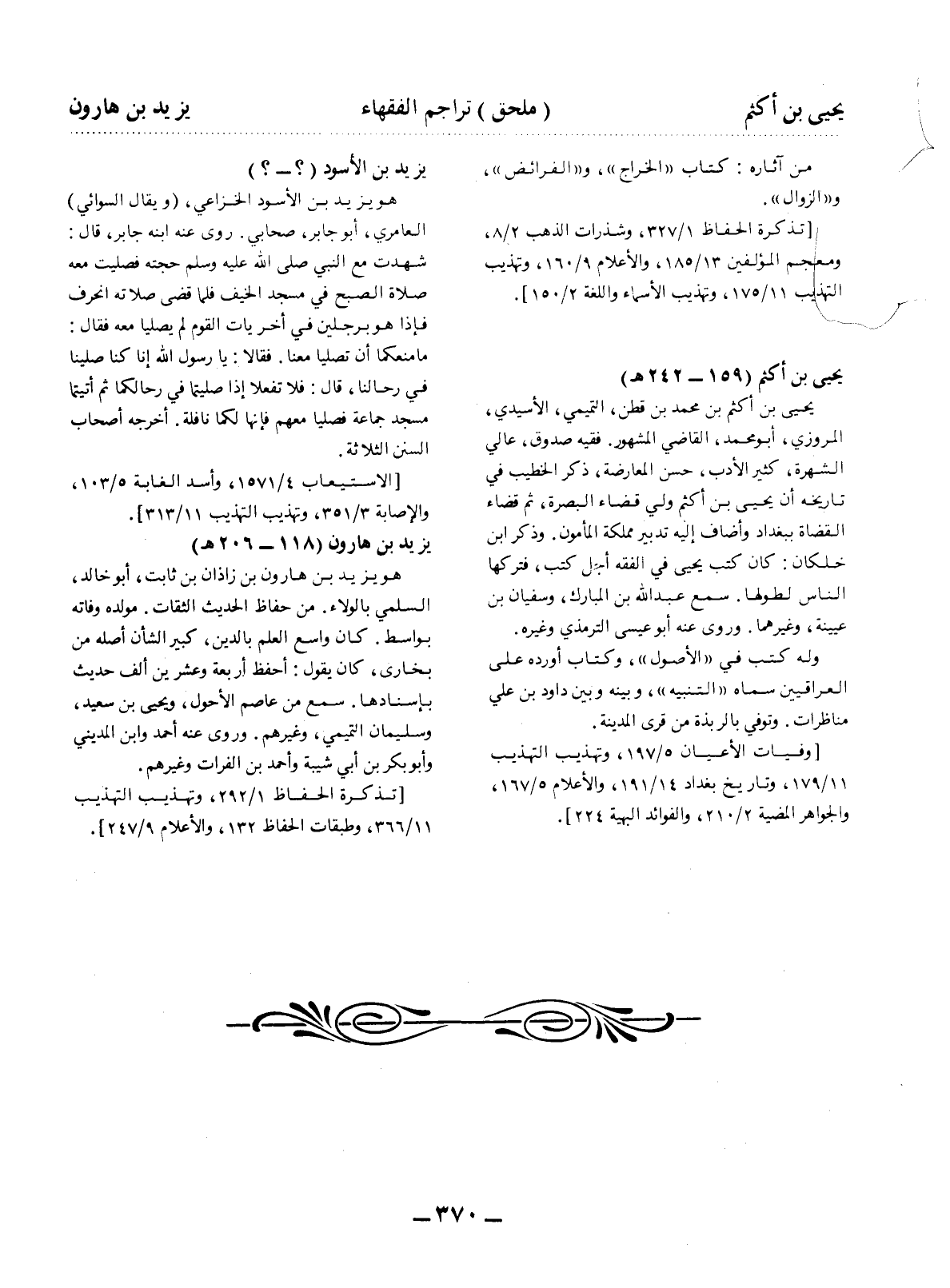 [وفيات الأعيان 5 / 197، وتهذيب التهذيب 11 / 179، وتاريخ بغداد 14 / 191، والأعلام 5 / 167، والجواهر المضية 2 / 210، والفوائد البهية 224] .