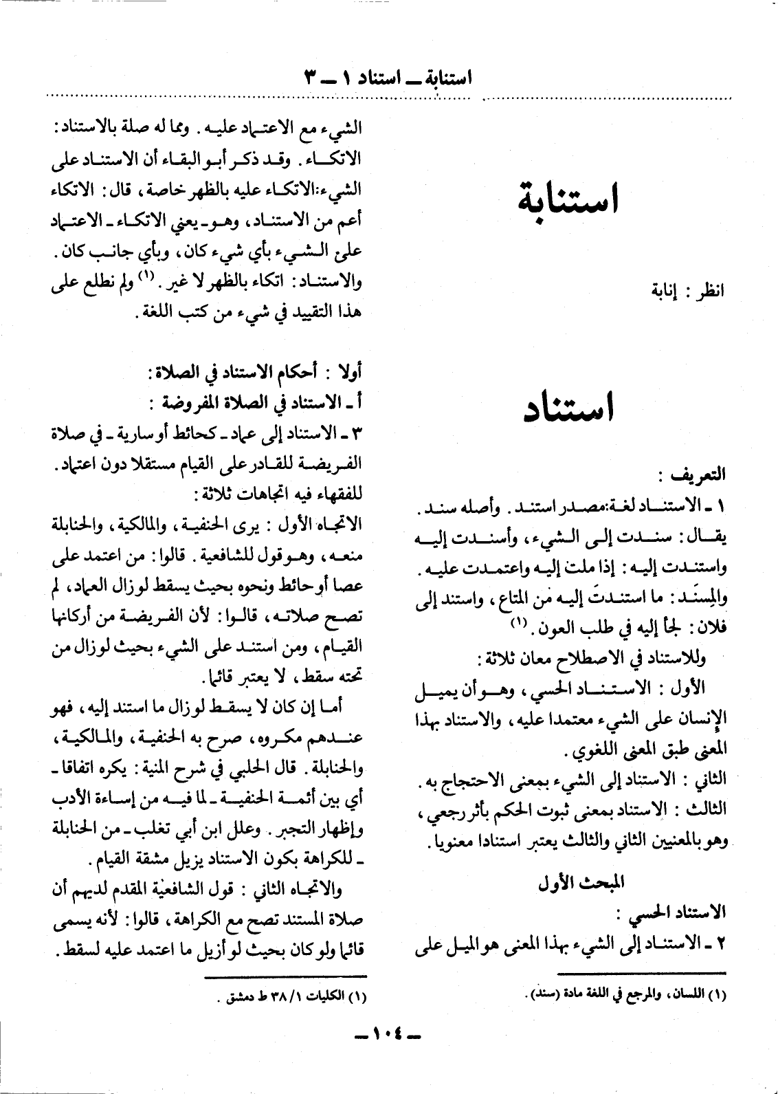 وَالاِسْتِنَادُ: اتِّكَاءٌ بِالظَّهْرِ لاَ غَيْرُ. (1) وَلَمْ نَطَّلِعْ عَلَى هَذَا التَّقْيِيدِ فِي شَيْءٍ مِنْ كُتُبِ اللُّغَةِ.