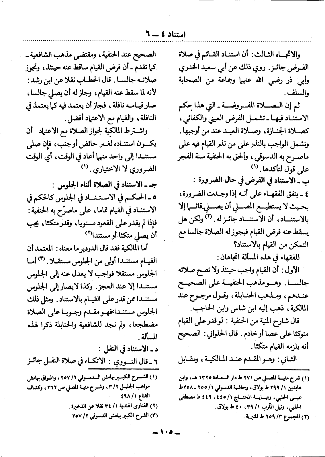 4 - يَتَّفِقُ الْفُقَهَاءُ عَلَى أَنَّهُ إِذَا وُجِدَتْ الضَّرُورَةُ، بِحَيْثُ لاَ يَسْتَطِيعُ الْمُصَلِّي أَنْ يُصَلِّيَ قَائِمًا إِلاَّ بِالاِسْتِنَادِ، أَنَّ الاِسْتِنَادَ جَائِزٌ لَهُ. (2) وَلَكِنْ هَل يَسْقُطُ عَنْهُ فَرْضُ الْقِيَامِ فَيَجُوزُ لَهُ الصَّلاَةُ جَالِسًا مَعَ التَّمَكُّنِ مِنَ الْقِيَامِ بِالاِسْتِنَادِ؟ لِلْفُقَهَاءِ فِي هَذِهِ الْمَسْأَلَةِ اتِّجَاهَانِ:
