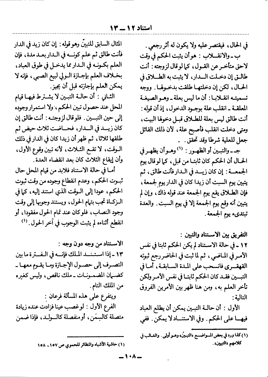 12 - فِي حَالَةِ الاِسْتِنَادِ لَمْ يَكُنِ الْحُكْمُ ثَابِتًا فِي نَفْسِ الأَْمْرِ فِي الْمَاضِي، ثُمَّ لَمَّا ثَبَتَ فِي الْحَاضِرِ رَجَعَ ثُبُوتُهُ الْقَهْقَرِيُّ فَانْسَحَبَ عَلَى الْمُدَّةِ السَّابِقَةِ، أَمَّا فِي التَّبَيُّنِ فَقَدْ كَانَ الْحُكْمُ ثَابِتًا فِي نَفْسِ الأَْمْرِ وَلَكِنْ تَأَخَّرَ الْعِلْمُ بِهِ، وَمِنْ هُنَا ظَهَرَ بَيْنَ الأَْمْرَيْنِ الْفُرُوقُ التَّالِيَةُ: