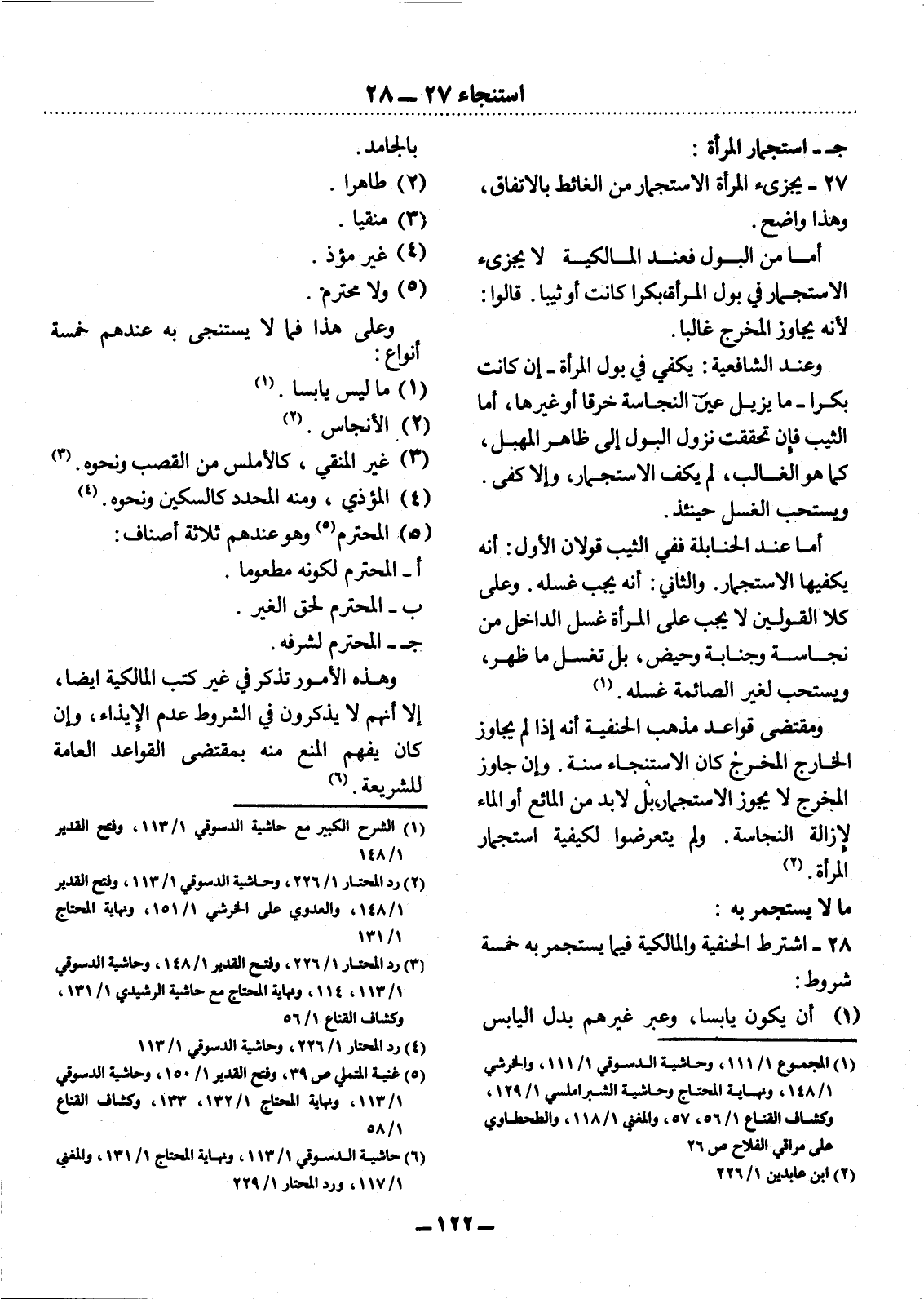 27 - يُجْزِئُ الْمَرْأَةَ الاِسْتِجْمَارُ مِنَ الْغَائِطِ بِالاِتِّفَاقِ، وَهَذَا وَاضِحٌ.