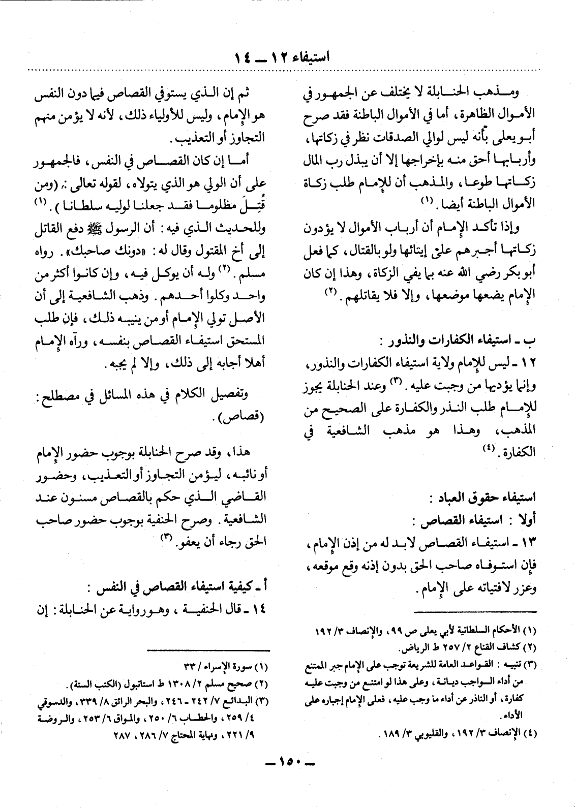 12 - لَيْسَ لِلإِْمَامِ وِلاَيَةُ اسْتِيفَاءِ الْكَفَّارَاتِ وَالنُّذُورِ، وَإِنَّمَا يُؤَدِّيهَا مَنْ وَجَبَتْ عَلَيْهِ. (3) وَعِنْدَ الْحَنَابِلَةِ يَجُوزُ لِلإِْمَامِ طَلَبُ النَّذْرِ وَالْكَفَّارَةِ عَلَى الصَّحِيحِ مِنَ الْمَذْهَبِ، وَهَذَا هُوَ مَذْهَبُ الشَّافِعِيَّةِ فِي الْكَفَّارَةِ. (4)