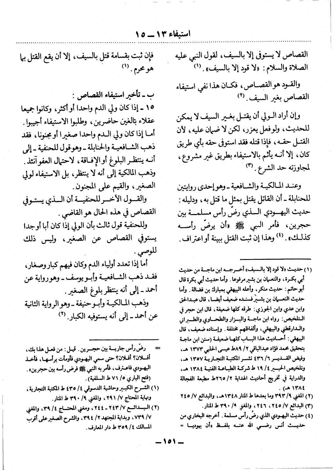 الْقِصَاصَ لاَ يُسْتَوْفَى إِلاَّ بِالسَّيْفِ، لِقَوْل النَّبِيِّ عَلَيْهِ الصَّلَاةُ وَالسَّلَامُ: لاَ قَوَدَ إِلاَّ بِالسَّيْفِ. (1)