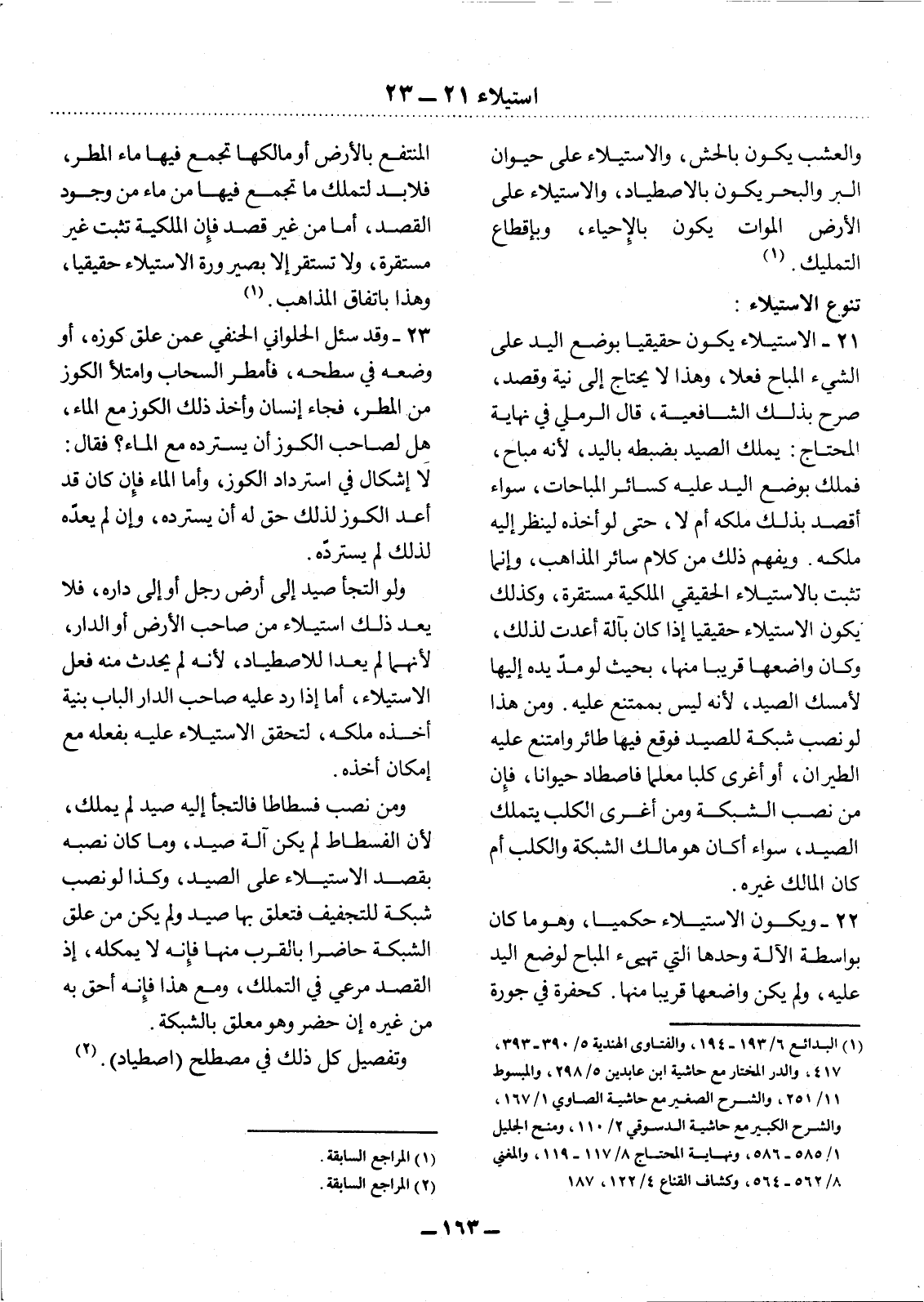 22 - وَيَكُونُ الاِسْتِيلاَءُ حُكْمِيًّا، وَهُوَ مَا كَانَ بِوَاسِطَةِ الآْلَةِ وَحْدَهَا الَّتِي تُهَيِّئُ الْمُبَاحَ لِوَضْعِ الْيَدِ عَلَيْهِ، وَلَمْ يَكُنْ وَاضِعُهَا قَرِيبًا مِنْهَا. كَحُفْرَةٍ فِي جَوَرَةِ