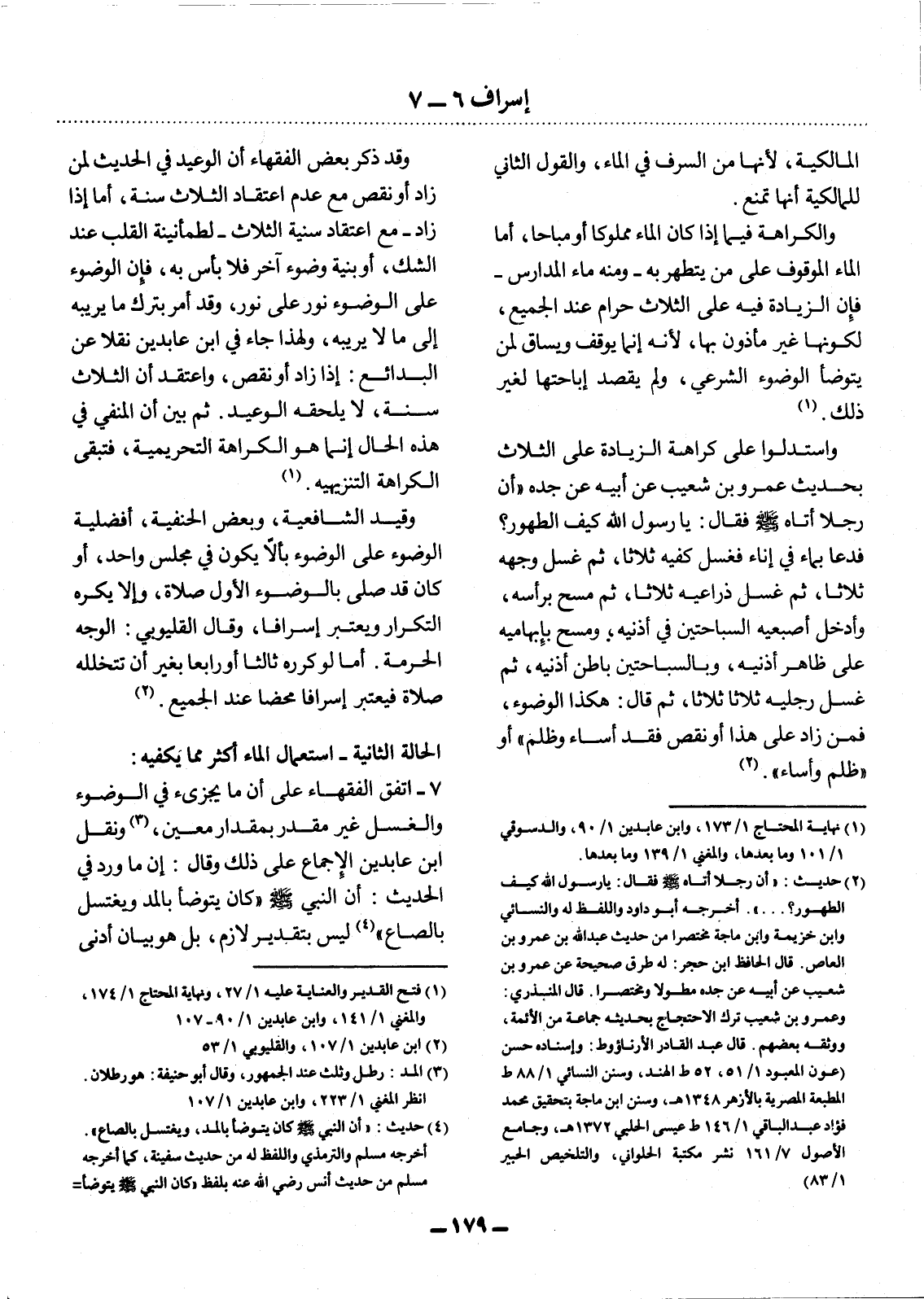 وَاسْتَدَلُّوا عَلَى كَرَاهَةِ الزِّيَادَةِ عَلَى الثَّلاَثِ بِحَدِيثِ عَمْرِو بْنِ شُعَيْبٍ عَنْ أَبِيهِ عَنْ جَدِّهِ أَنَّ رَجُلاً أَتَاهُ صَلَّى اللَّهُ عَلَيْهِ وَسَلَّمَ فَقَال: يَا رَسُول اللَّهِ كَيْفَ الطُّهُورُ؟ فَدَعَا بِمَاءٍ فِي إِنَاءٍ فَغَسَل كَفَّيْهِ ثَلاَثًا، ثُمَّ غَسَل وَجْهَهُ ثَلاَثًا، ثُمَّ غَسَل ذِرَاعَيْهِ ثَلاَثًا، ثُمَّ مَسَحَ بِرَأْسِهِ، وَأَدْخَل أُصْبُعَيْهِ السَّبَّاحَتَيْنِ فِي أُذُنَيْهِ، وَمَسَحَ بِإِبْهَامَيْهِ عَلَى ظَاهِرِ أُذُنَيْهِ، وَبِالسَّبَّاحَتَيْ نِ بَاطِنَ أُذُنَيْهِ، ثُمَّ غَسَل رِجْلَيْهِ ثَلاَثًا ثَلاَثًا، ثُمَّ قَال: هَكَذَا الْوُضُوءُ، فَمَنْ زَادَ عَلَى هَذَا أَوْ نَقَصَ فَقَدْ أَسَاءَ وَظَلَمَ أَوْ ظَلَمَ وَأَسَاءَ (2) .