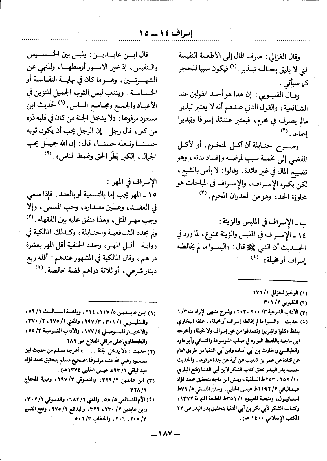 14 - الإِْسْرَافُ فِي الْمَلْبَسِ وَالزِّينَةِ مَمْنُوعٌ، لِمَا وَرَدَ فِي الْحَدِيثِ أَنَّ النَّبِيَّ صَلَّى اللَّهُ عَلَيْهِ وَسَلَّمَ قَال: الْبَسُوا مَا لَمْ يُخَالِطْهُ إِسْرَافٌ أَوْ مَخِيلَةٌ. (4)