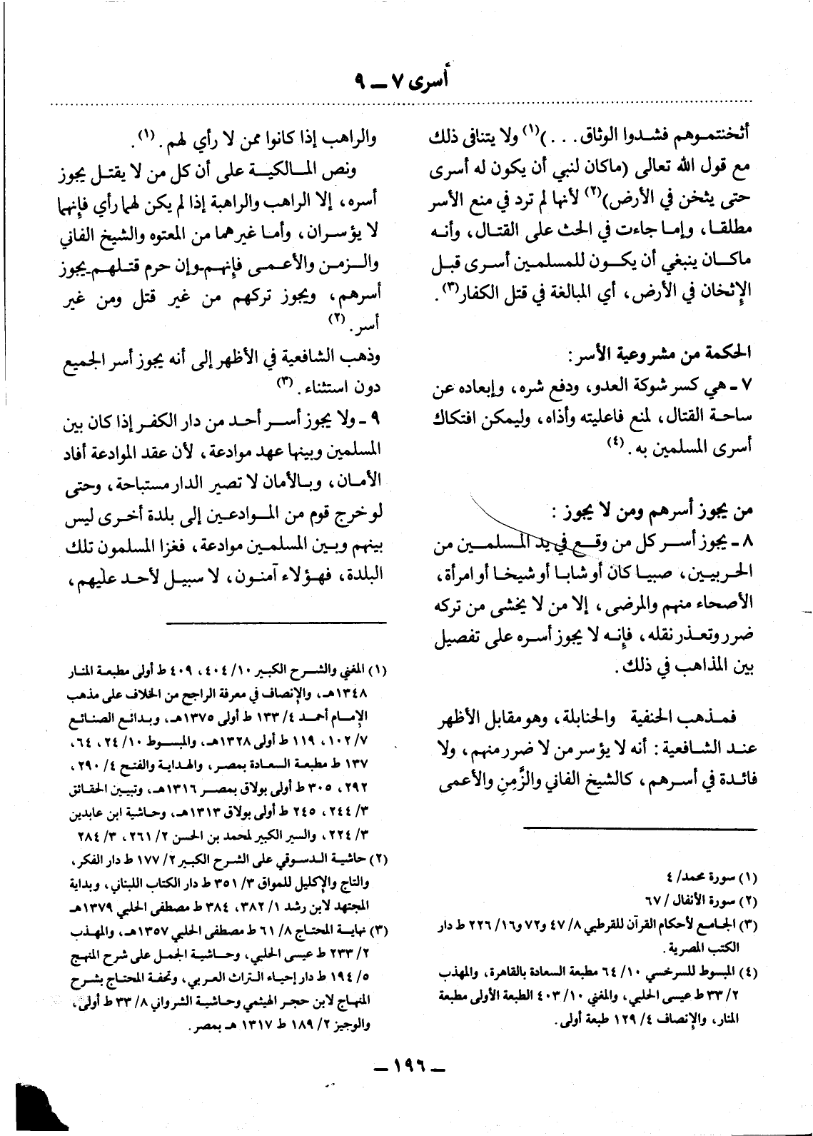 (1) المغني والشرح الكبير 10 / 404، 409 ط أولى مطبعة المنار 1348 هـ، والإنصاف في معرفة الراجح من الخلاف على مذهب الإمام أحمد 4 / 133 ط أولى 1375 هـ، وبدائع الصنائع 7 / 102، 119 ط أولى 1328 هـ، والمبسوط 10 / 24، 64، 137 ط مطبعة السعادة بمصر، والهداية والفتح 4 / 290، 292، 305 ط أولى بولاق بمصر 1316 هـ، وتبيين الحقائق 3 / 244، 245 ط أولى بولاق 1313 هـ، وحاشية ابن عابدين 3 / 224، والسير الكبير لمحمد بن الحسن 2 / 261، 3 / 284.