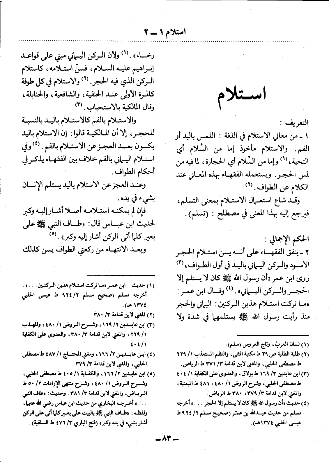 (1) حديث ابن عمر " ما تركت استلام هذين الركنين. . . ". أخرجه مسلم (صحيح مسلم 2 / 924 ط عيسى الحلبي 1374 هـ) .